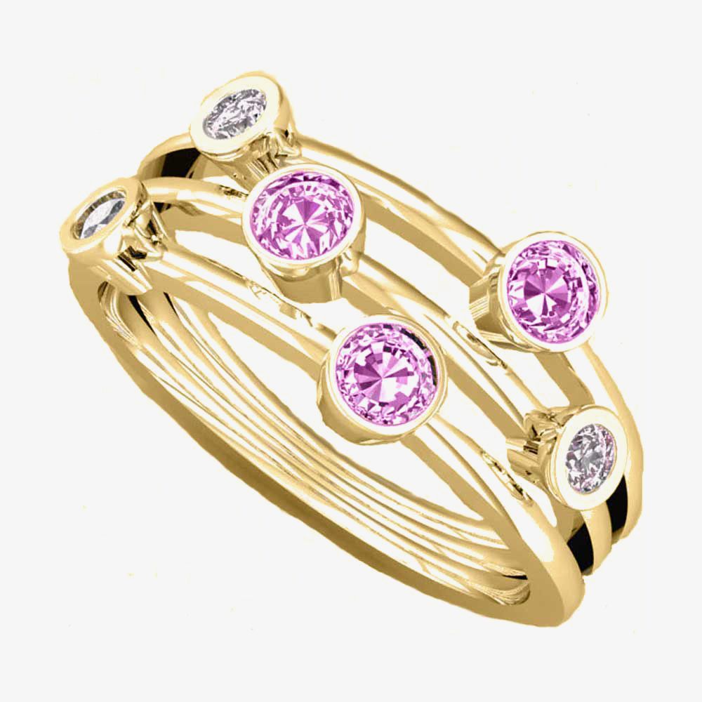 The triple bands of 9ct gold hold stunning bezel set diamonds and pink topaz aloft, featuring a round brilliant cut that will give a wonderful sparkle to any ring finger.