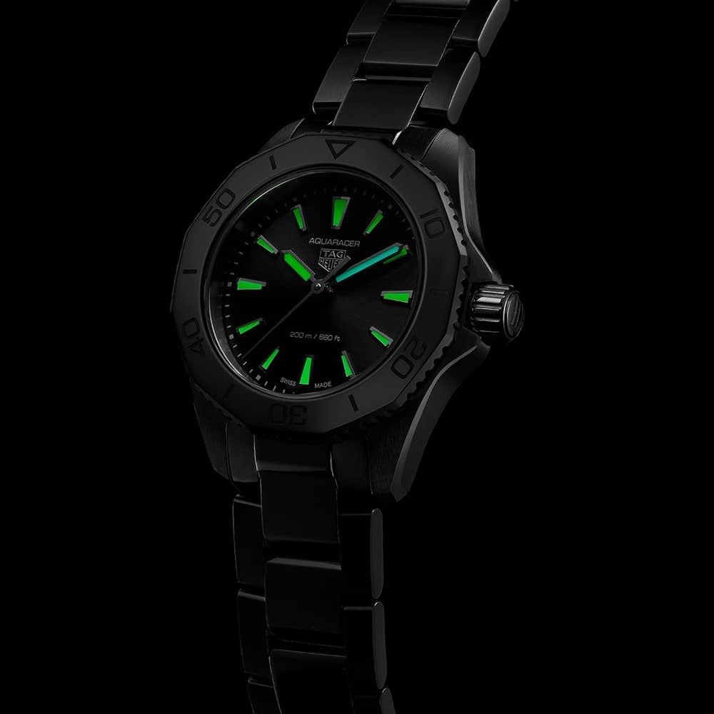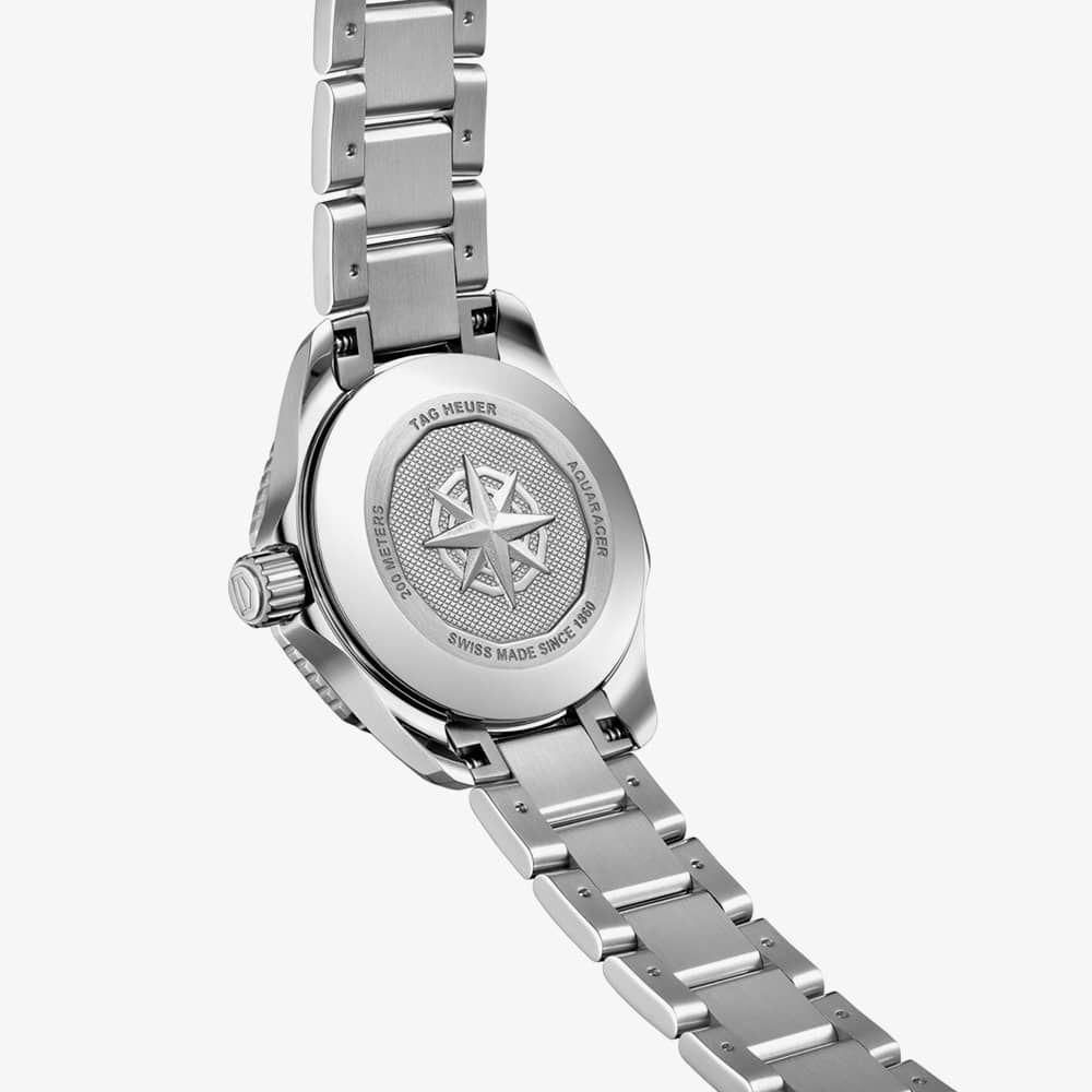 The TAG Heuer Aquaracer Professional 200 WBP1410.BA0622 watch combines a 30mm round shaped stainless steel case and silver stainless steel bracelet with a push button deployment clasp. It has a black analogue dial which is protected beneath sapphire crystal glass. Power is generated by the quartz movement. This model also has a water resistance of up to 200 metres.