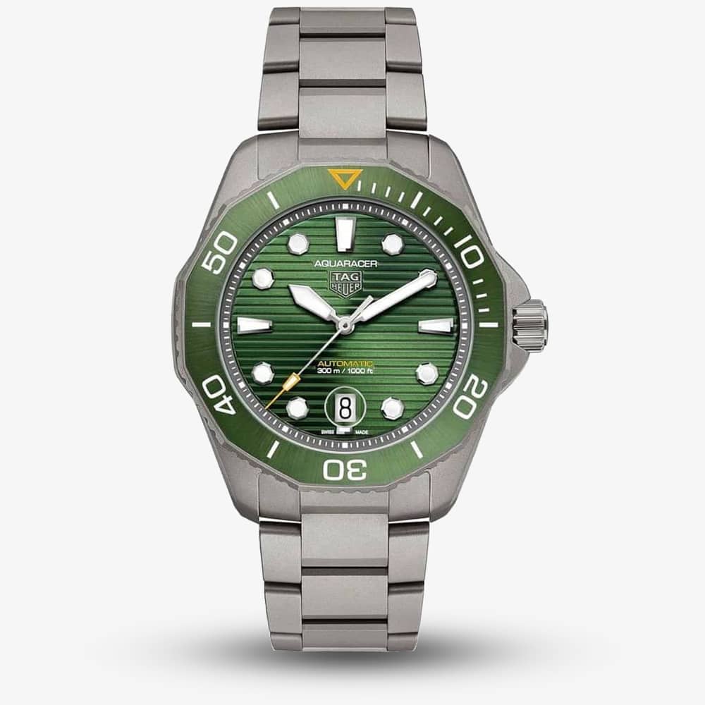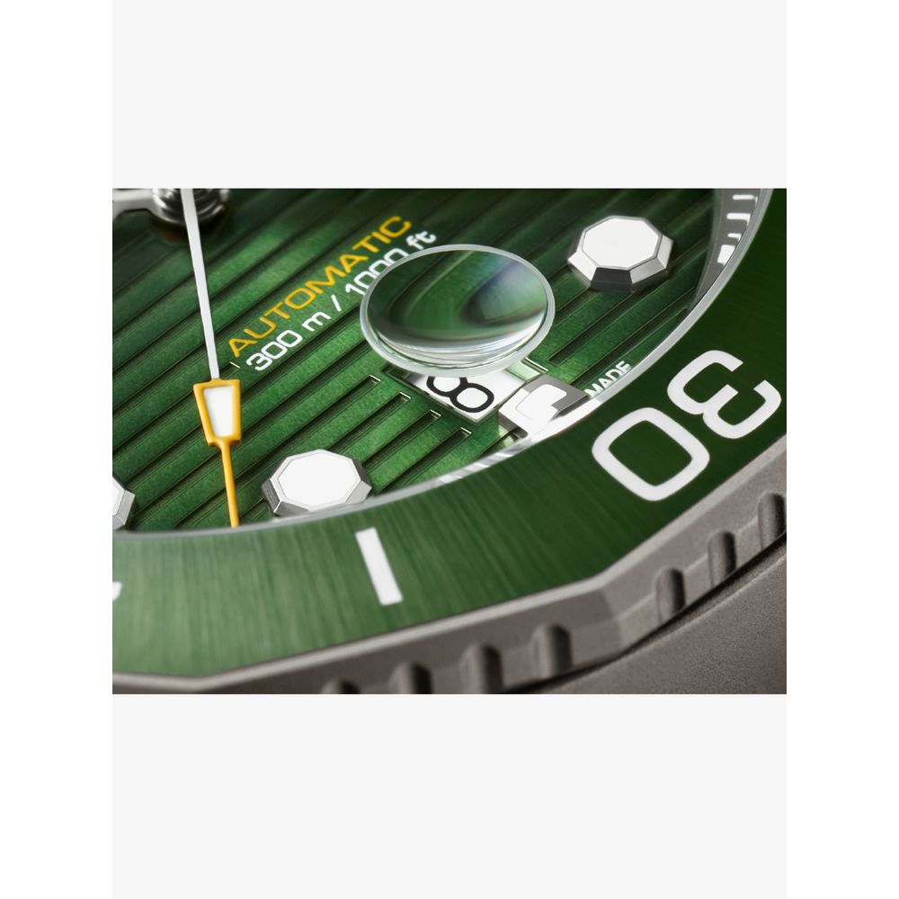 The TAG Heuer Professional WBP208B.BF0631 watch combines a 43mm round shaped titanium case with a turning ceramic bezel and titanium bracelet with a push button deployment clasp. It has a green sunray brushed analogue dial with date display which is protected beneath a sapphire crystal glass. Power is generated by the automatic Calibre 5 movement. This model also has a water resistance of up to 300 metres.