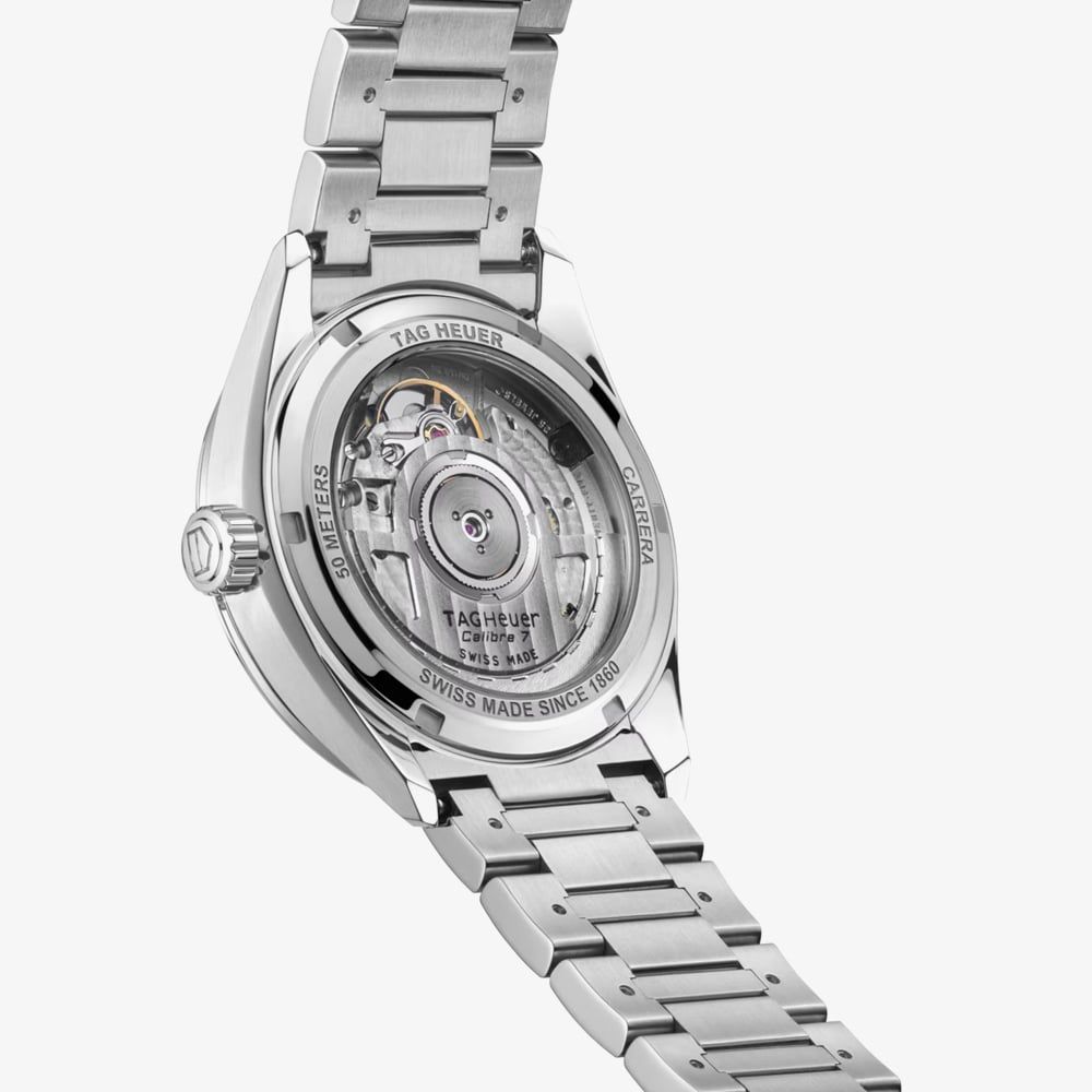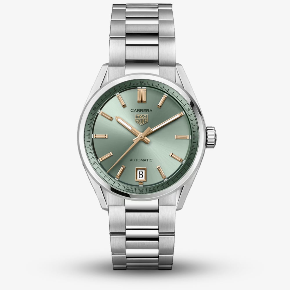 The TAG Heuer Carrera was created on the race tracks in 1963 and exudes an elegant but sporty vibe. The TAG Heuer Carrera WBN2312.BA0001 has been created with a Calibre 7 Automatic movement with a subtle pastel green sunray brushed dial and eye-catching 18K 5N rose gold-plated hands and applied indexes for that luxurious elegant feel.