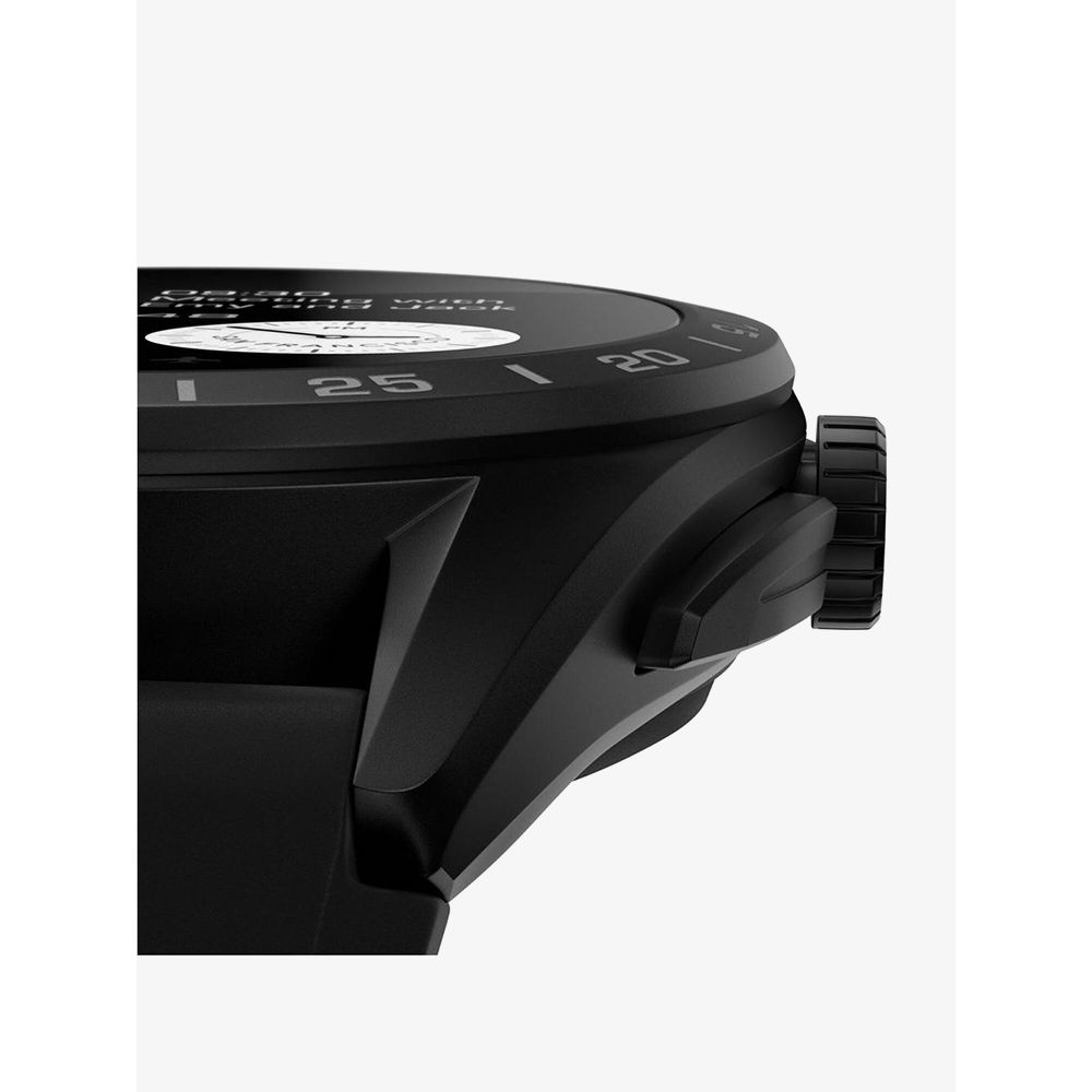 The TAG Heuer connected E4 Black Case & Strap SBR8A80.BT6261 smartwatch combines a round shaped Titanium case and black rubber strap with a fold over clasp. It has a touchscreen dial which is protected beneath sapphire crystal glass. Power is generated by the quartz movement. This model also has a water resistance of up to 50 metres. The watches case has a sandblasted matt black finish.