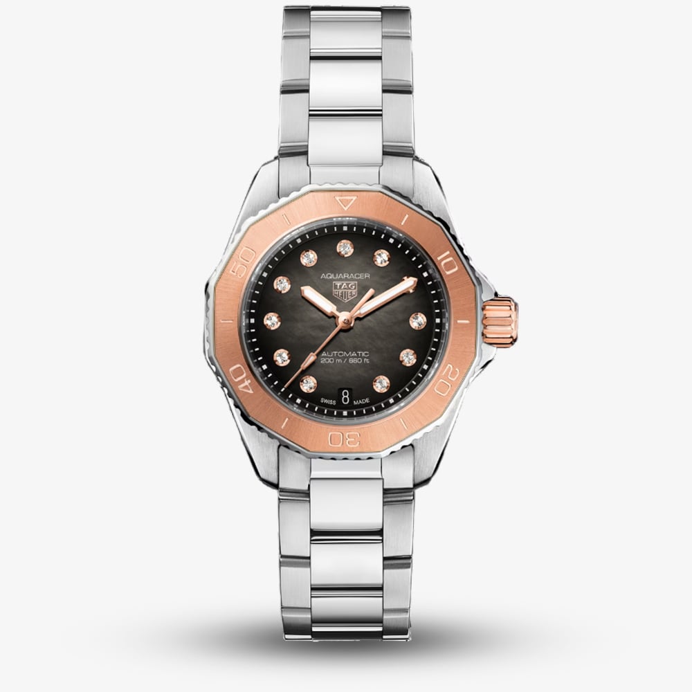 With its perfectly proportioned 30mm stainless steel case, this timepiece features an eye-catching 18ct rose gold unidirectional rotating bezel, adding a touch of warmth and sophistication to its sleek profile. The black sunray-brushed dial radiates understated beauty, enhanced by rose gold-plated hands and diamond hour markers. A discreet date window adds functional elegance without compromising the watch’s clean design.