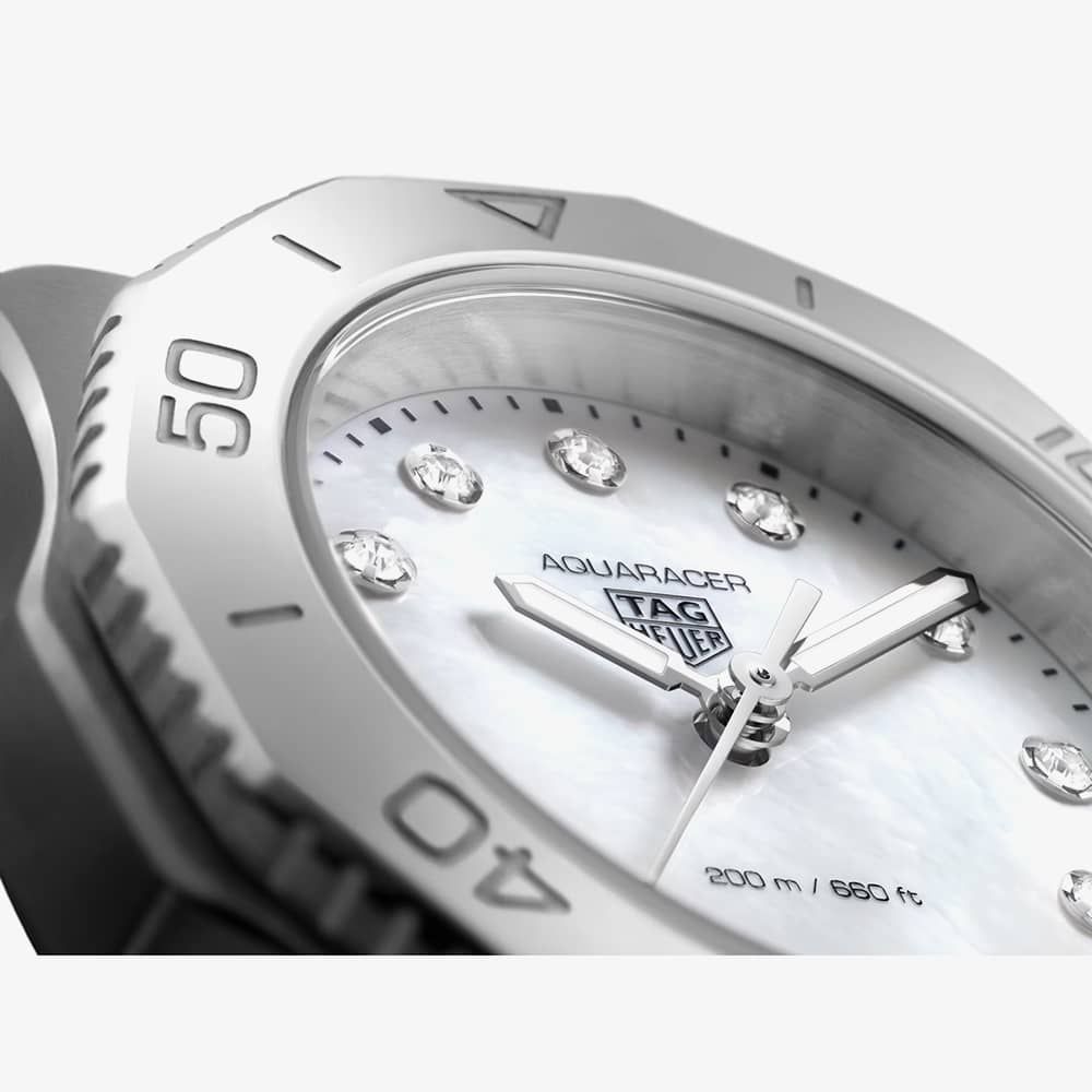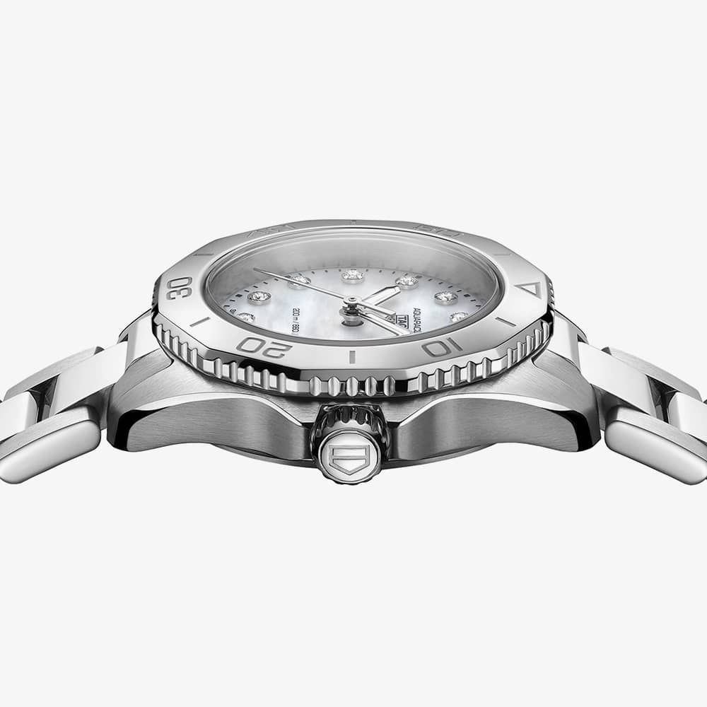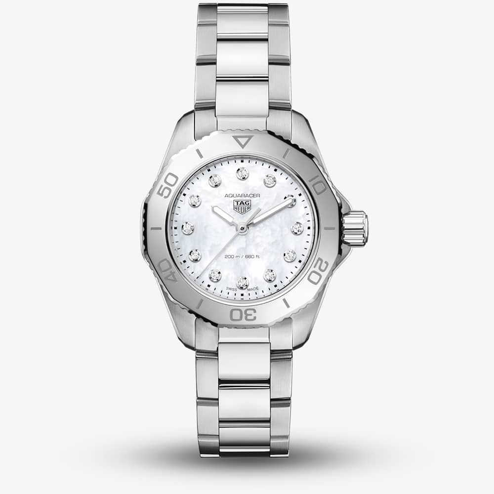 The TAG Heuer Ladies Aquaracer Professional 200 WBP1416.BA0622 watch combines a 30mm round shaped stainless steel case and silver stainless steel bracelet with a push button deployment clasp. It has a mother of pearl analogue dial which is protected beneath sapphire crystal glass. Power is generated by the quartz movement. This model also has a water resistance of up to 200 metres.