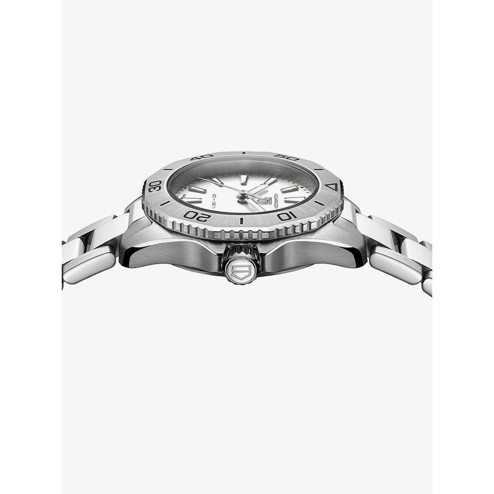 The TAG Heuer Ladies Aquaracer Professional 200 WBP1411.BA0622 watch combines a 30mm round shaped stainless steel case and silver stainless steel bracelet with a special clasp. It has a white analogue dial which is protected beneath sapphire crystal glass. Power is generated by the quartz movement. This model also has a water resistance of up to 200 metres.