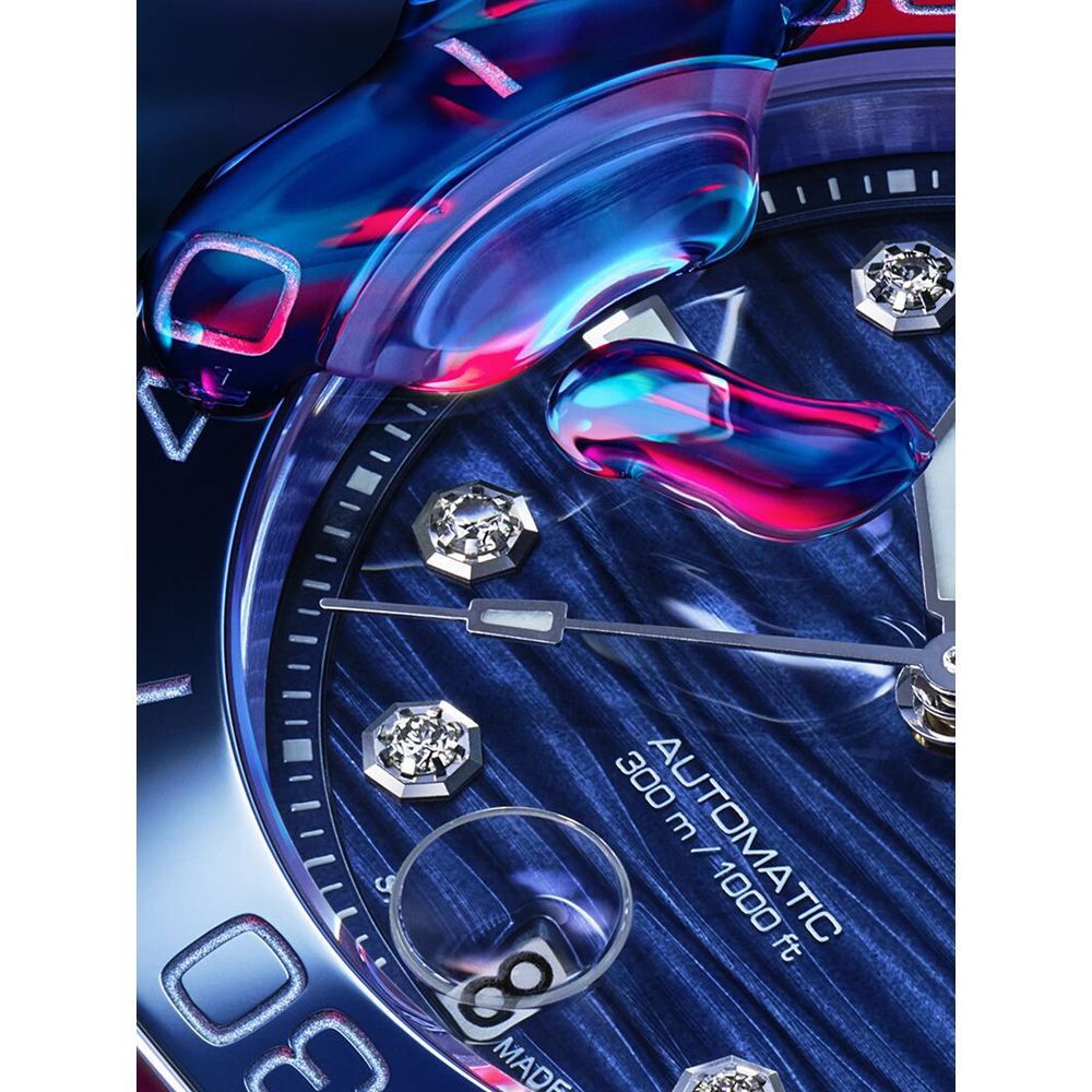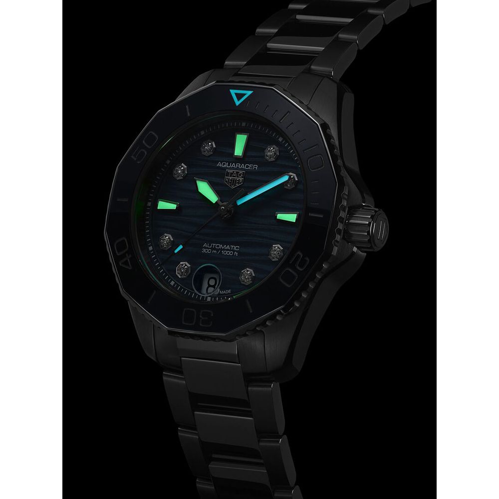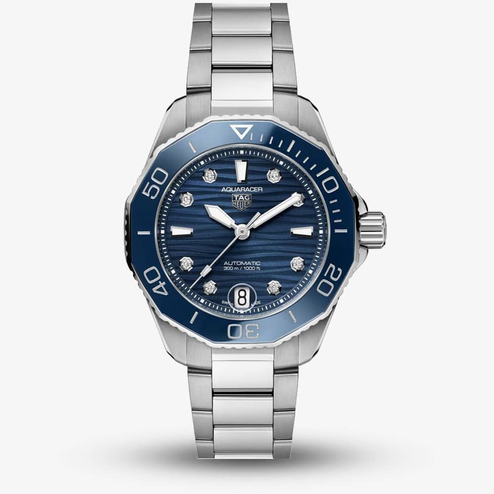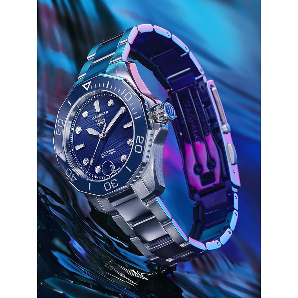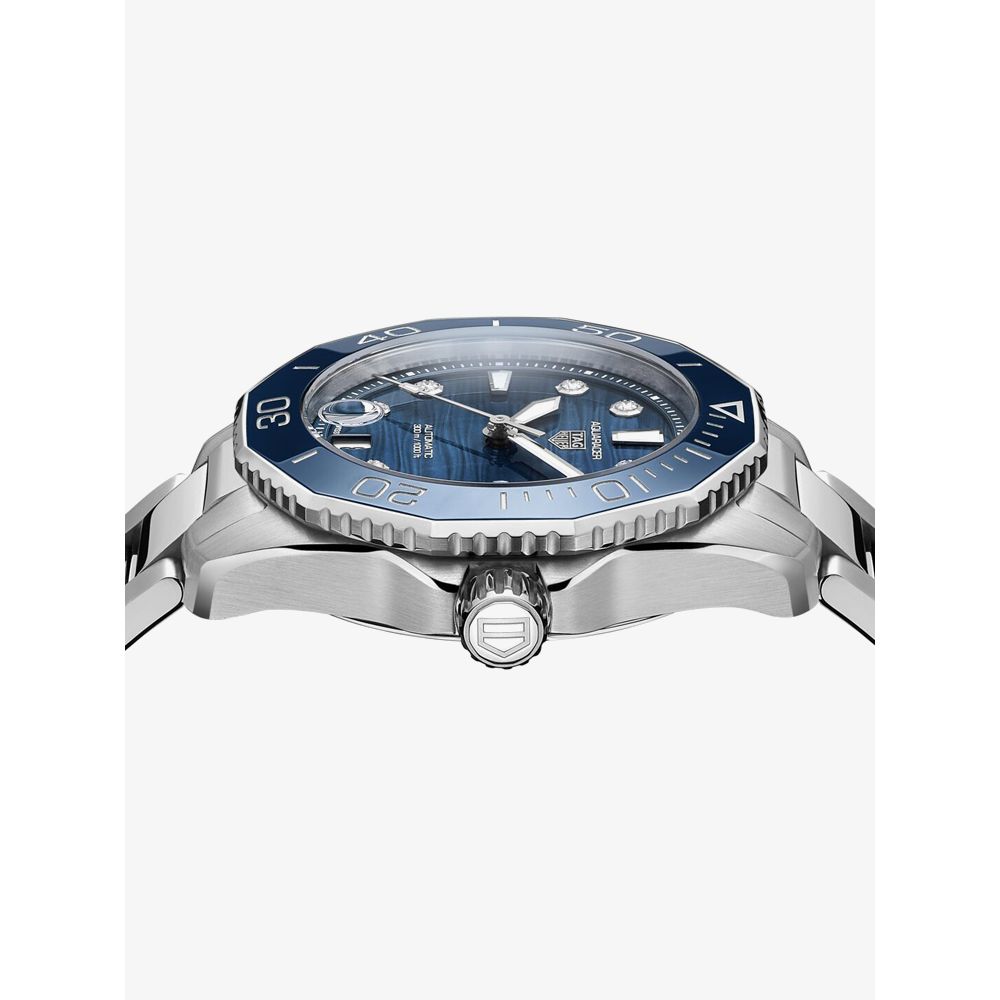 The TAG Heuer WBP231B.BA0618 Aquaracer watch combines a 36mm stainless steel case and bracelet with a push button deployment clasp. It has a blue unidirectional ceramic bezel and blue analogue dial which is protected beneath scratch resistant sapphire crystal glass. The dial also has luminescent hands, a date display and 8 VS diamonds totalling 0.078 carat. Power is generated by the Calibre 5 automatic movement with a 38 hour power reserve. This model also has a water resistance of up to 300 metres.