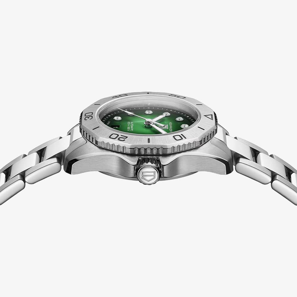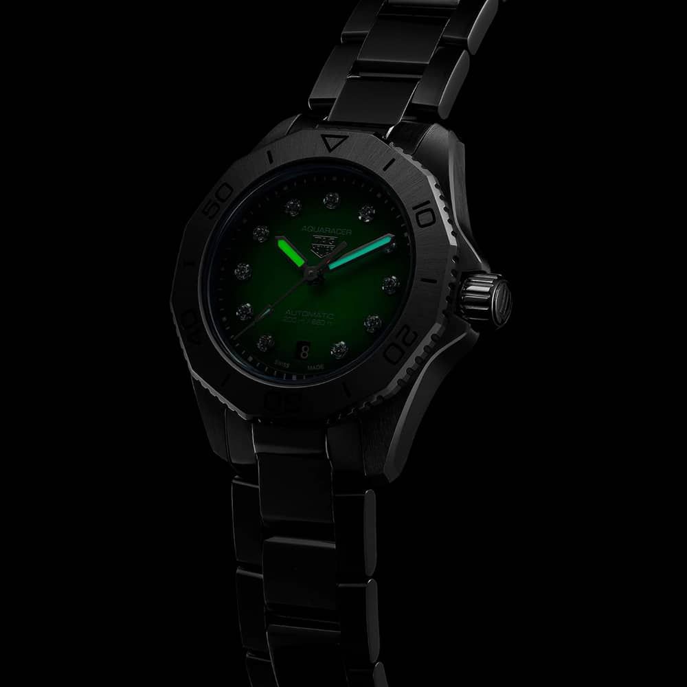 This TAG Aquaracer is a beautiful design that is great for diving and when wearing dress wear. The dial is a green fade to black colour and features 11 vs 1.4 mm diamond indexes (0.107ct). The watch also features a Stainless-steel bezel.