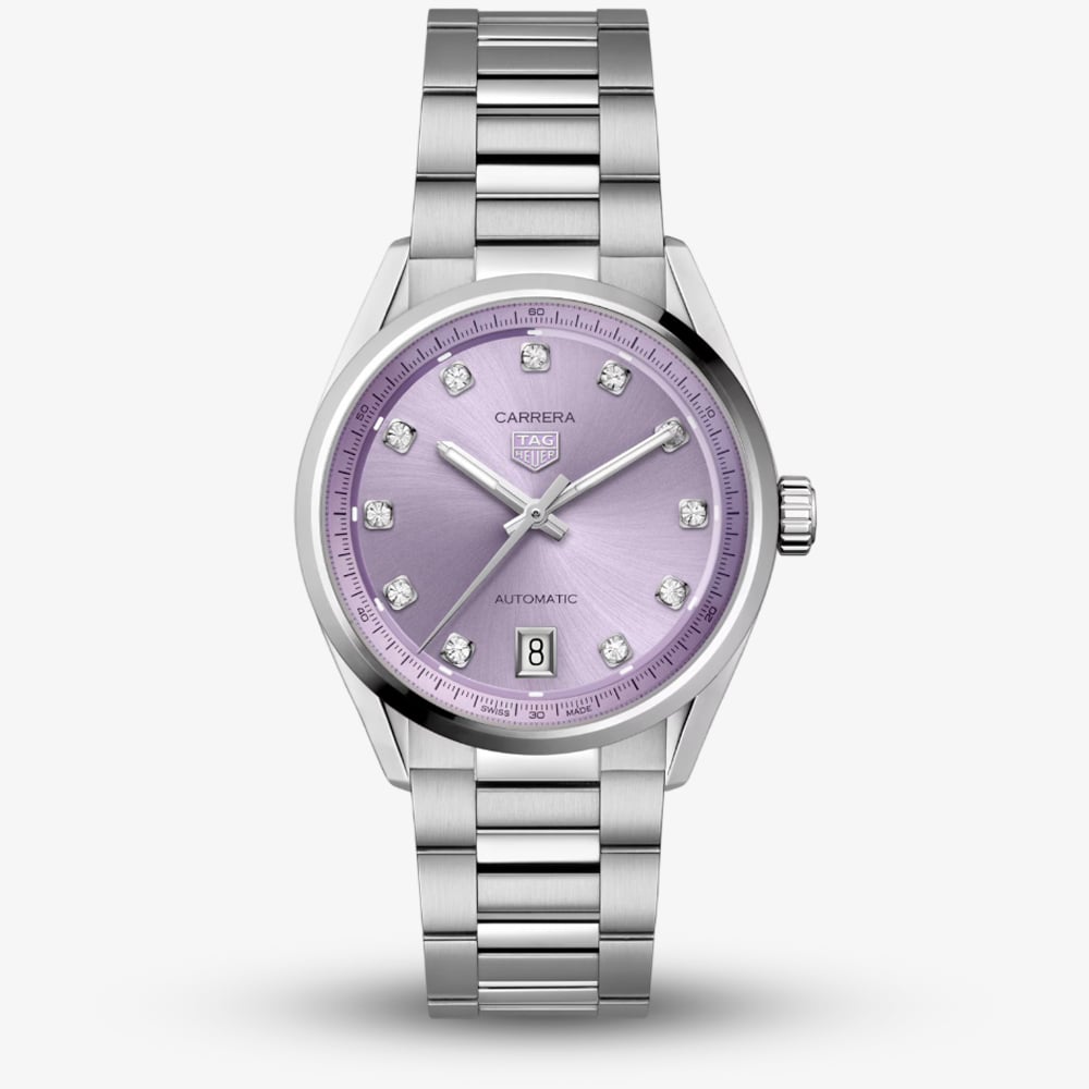 This watch features a sleek stainless steel case and bracelet, exuding durability and timeless appeal. Its standout feature is the luxurious purple dial, adding a vibrant contrast and a touch of sophistication to any ensemble. The dial is adorned with silver-tone hands and diamond hour markers, ensuring clear readability at all times. Powered by a reliable automatic movement, this watch delivers accurate timekeeping. It includes a date window positioned at 6 o'clock, enhancing its practicality for everyday use. The scratch-resistant sapphire crystal glass protects the dial from scratches and ensures longevity, making it ideal for daily wear. Whether for a special occasion or everyday elegance, this watch is a statement piece that reflects a commitment to quality.