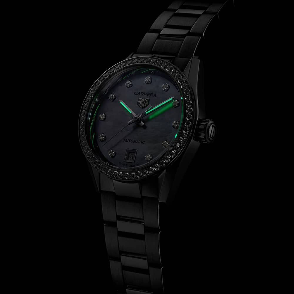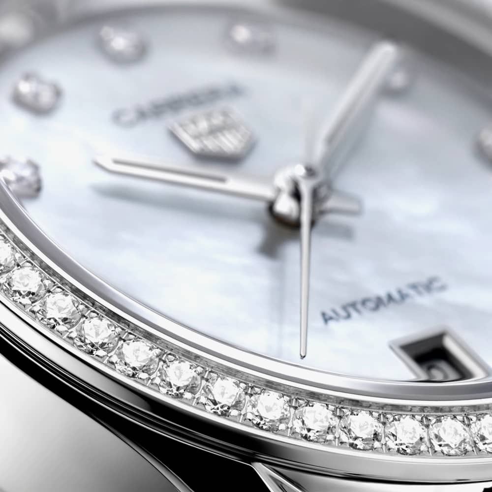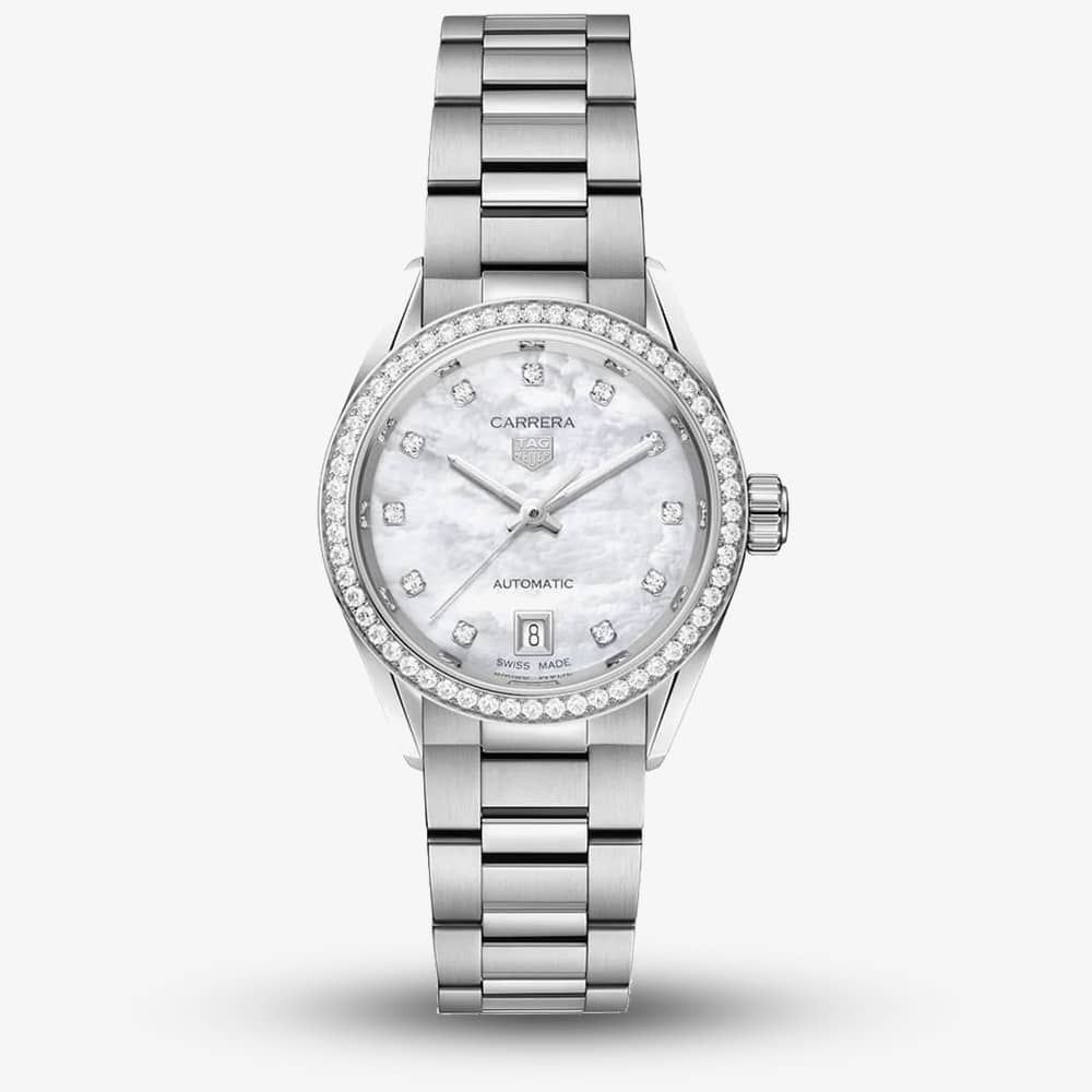 The TAG Heuer WBN2414.BA0621 watch combines a 29mm round shaped stainless-steel case and silver stainless steel bracelet with a push button deployment clasp. It has a mother of pearl analogue dial with 0.088ct diamond set hour markers luminescent hands, diamond hour markers and a date display which is protected beneath domed scratch resistant sapphire crystal glass with anti-reflective treatment. Power is generated by the calibre 9 automatic movement which can be seen through the sapphire crystal case back and has a power reserve of 40 hours. This model also has a water resistance of up to 100 metres. Watch also features 56 diamonds 0.54ct around the whole bezel.