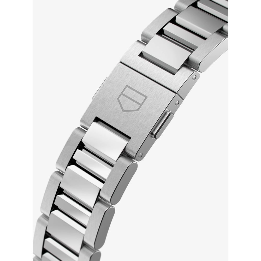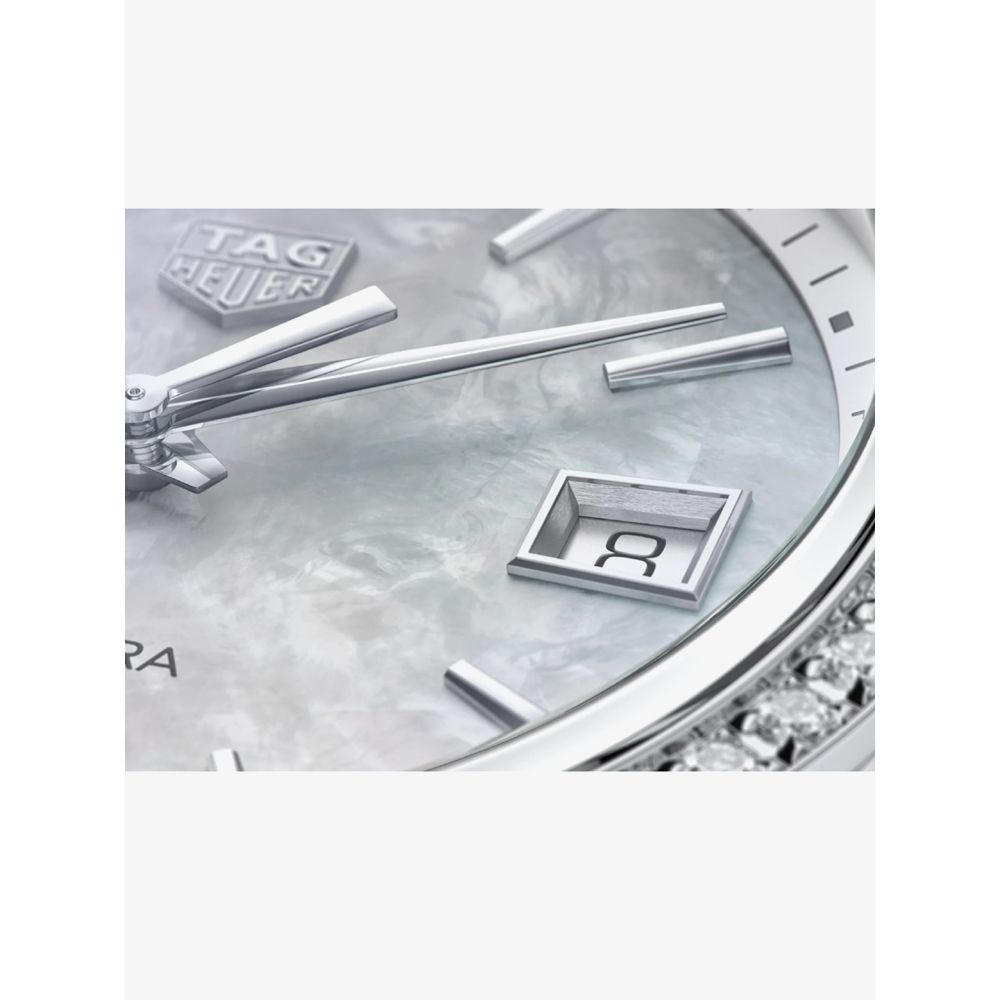 TAG Heuer introduces this Carrera watch featuring a Swiss made quartz movement with an end of life indicator. The 36mm stainless steel case is set with 54 diamonds and presented on a matching bracelet equipped with a fold over clasp. Anti-reflective treated sapphire crystal protects the dial and allows a water resistance of up to 100 metres. The white mother of pearl dial also has a trio of silver tone dial hands and a date display.