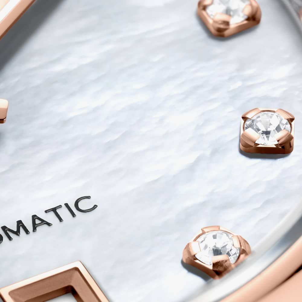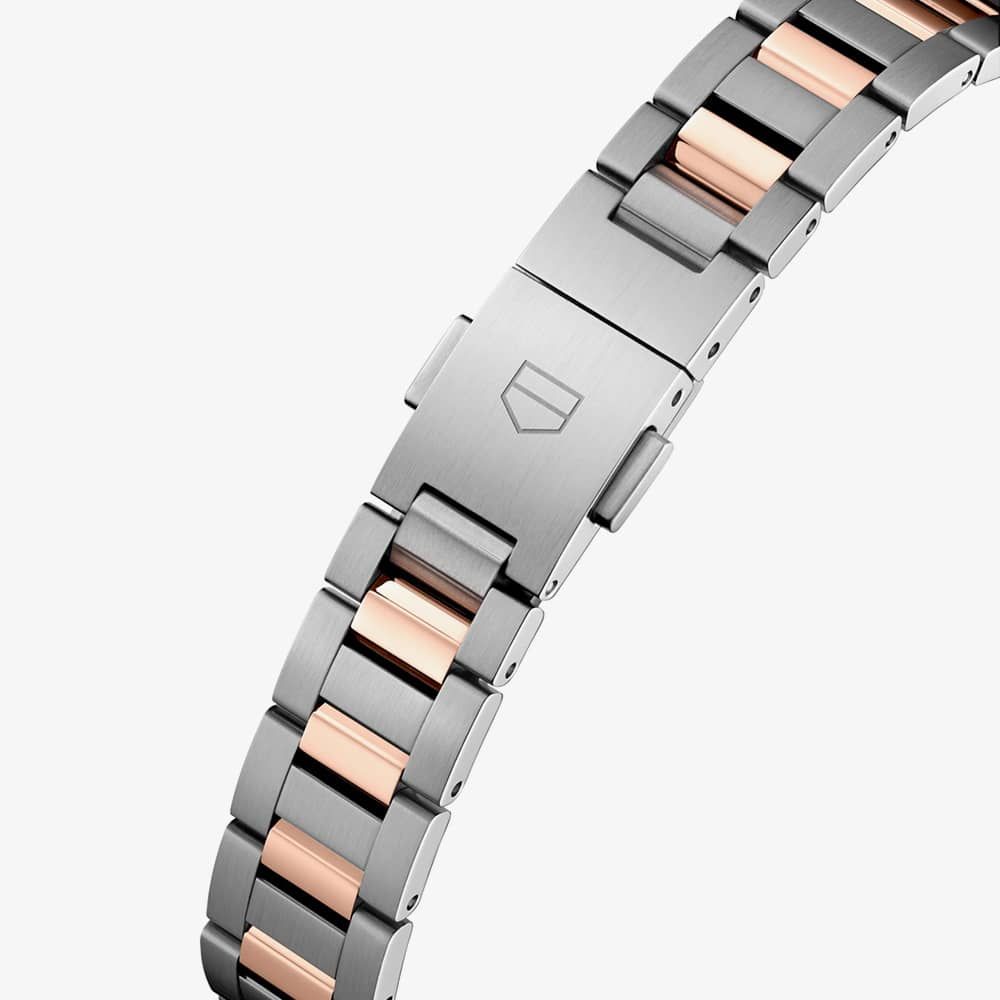 The TAG Heuer WBN2450.BD0569 watch combines a 29mm round shaped stainless-steel case and two colour 18ct Rose Gold stainless steel bracelet with a push button deployment clasp. It has a mother of pearl analogue dial with luminescent hands, 11 diamond hour markers and a date display which is protected beneath domed scratch resistant sapphire crystal glass with anti-reflective treatment. Power is generated by the calibre 9 automatic movement, it can be seen through the sapphire crystal case back and has a power reserve of 40 hours. This model also has a water resistance of up to 100 metres.