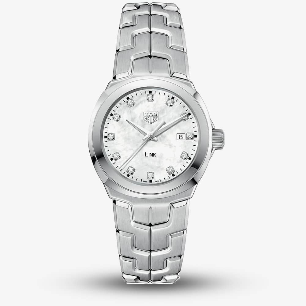 The enchanting Link series from TAG Heuer consists of a range of flawlessly created watches showcasing the quality and craftsmanship they are renowned for. A fine brushed and polished effect has been applied to the stainless steel used to form this piece, with the bracelet produced from a collection of uniquely shaped links which combine to form a comfortable and sturdy bracelet, teamed with a highly reliable push button deployment clasp. An exemplary bezel frames the magnificent mother of pearl background, which features a trio of elegantly styled dial hands displaying hours, minutes and seconds. A stand out black minute’s scale encircles the outer edge with every 5 minute marker displayed by a bigger and bolder square shaped indicator. The hours on this item are represented by 12 glistening diamonds providing an elegant sparkle, with the brands world renowned logo applied in a protruding manor at the 12 o’clock position. A useful date window has been placed next to the diamond at 3 o’clock offering a great extra feature, with the entirety of the dial protected underneath a remarkable scratch resistant anti-reflective sapphire crystal glass dome. A water resistance of up to 100 metres offers an extraordinary practical attribute, alongside the highly accurate level of timekeeping assured to always keep you on time. A reliable quartz movement powers the intricate mechanism, which is achieved by an electrical current consistently vibrating a crystal at a frequency of 32,768 times per second, producing a near flawless level of precision. Accentuate your style with this beautifully fashioned timepiece.