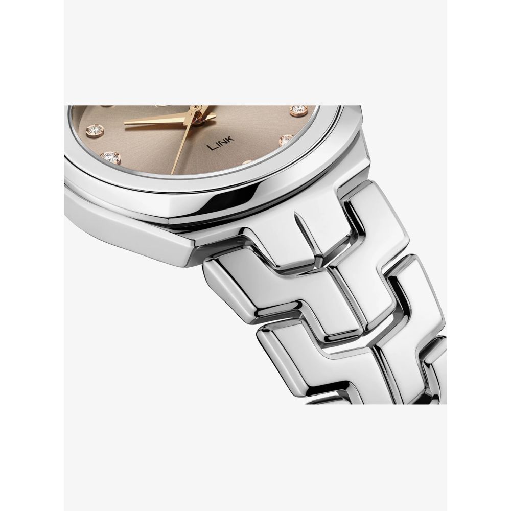 From the Link collection, an elegant watch design featuring a taupe dial with rose gold-toned indexes set with 11 eye catching Diamonds and date display at 3o’clock position. Crafted in stainless steel with a hard wearing sapphire crystal glass this model would make a perfect and versatile timepiece to add to your collection.