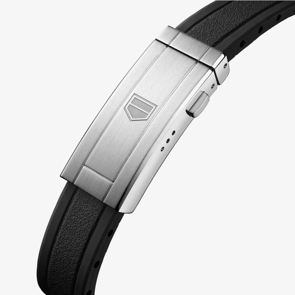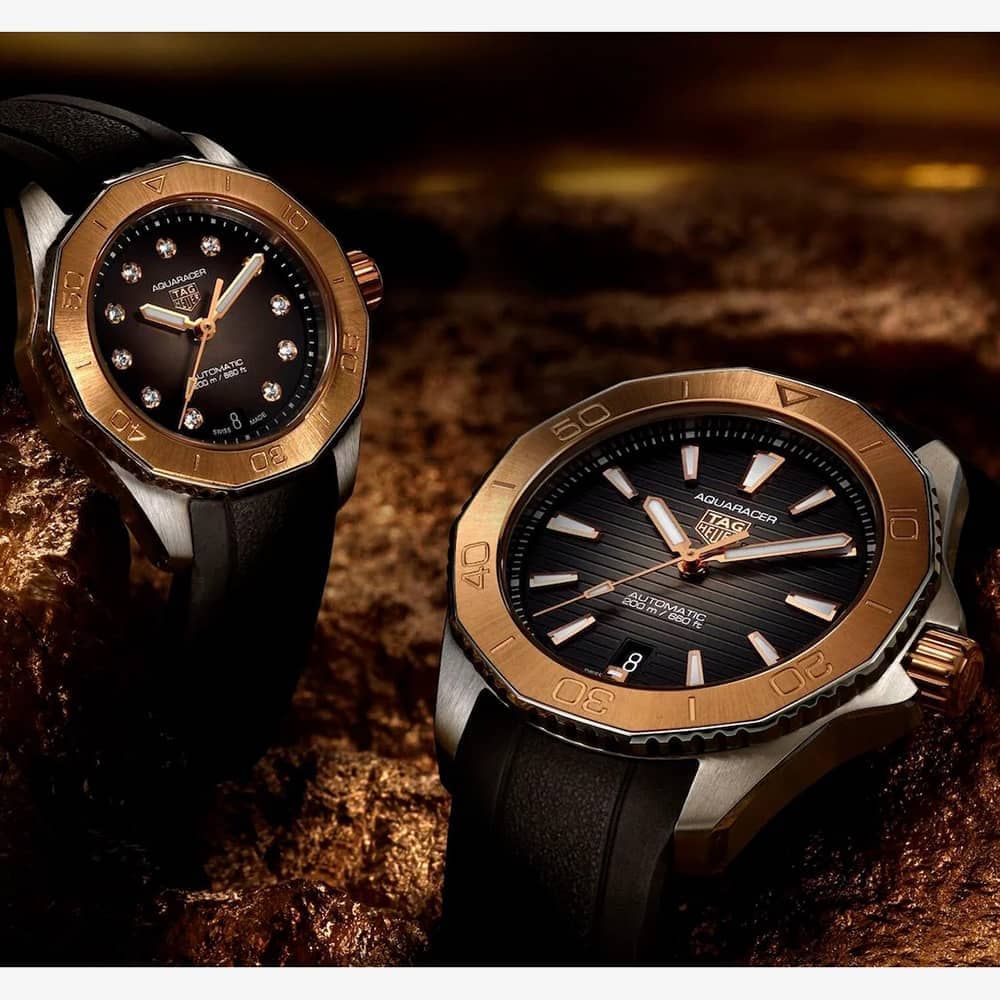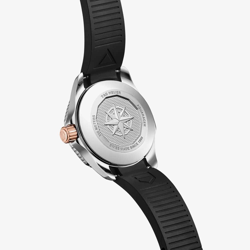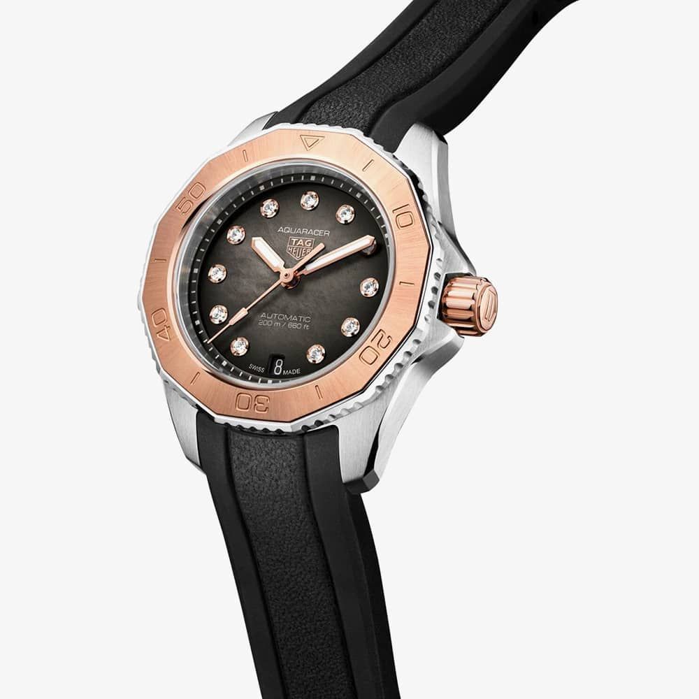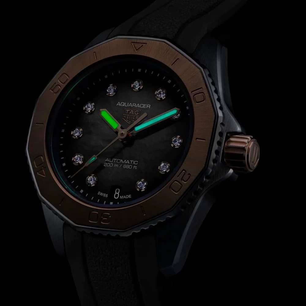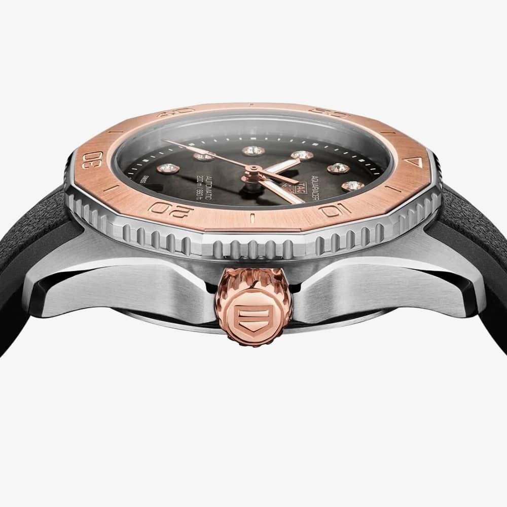 This TAG Aquaracer is a beautiful design that is great for diving and when wearing dress wear. The dial is a grey fade to black colour and features 11 vs 1.4 mm diamond indexes (0.107ct) that are held in by 18k rose gold. The watch also features a 18k rose gold unidirectional bezel.