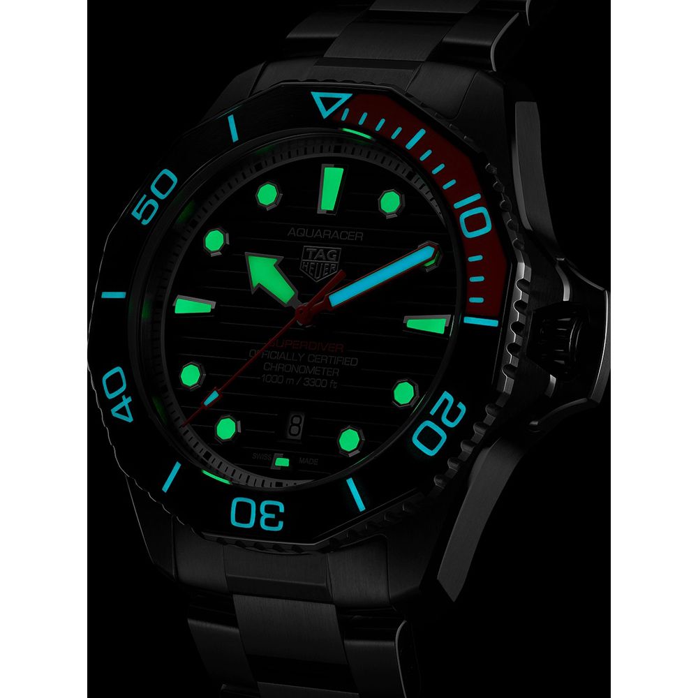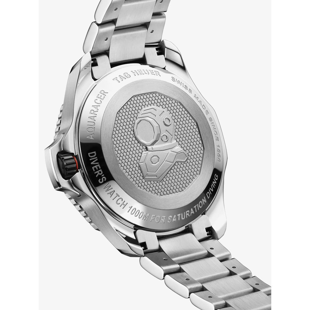 The TAG Heuer Mens Aquaracer Professional 1000 Superdiver Watch WBP5A8A.BF0619 combines a round shaped iso 6425:2018 titanium case and silver titanium bracelet with a push button deployment clasp. It has a black analogue dial with super luminova luminescent hands, date display which is protected beneath anti reflective scratch resistant sapphire crystal glass. Power is generated by the automatic movement. This model also has a water resistance of up to 1000 metres and features a helium escape valve to handle 1000 meters of depth.
