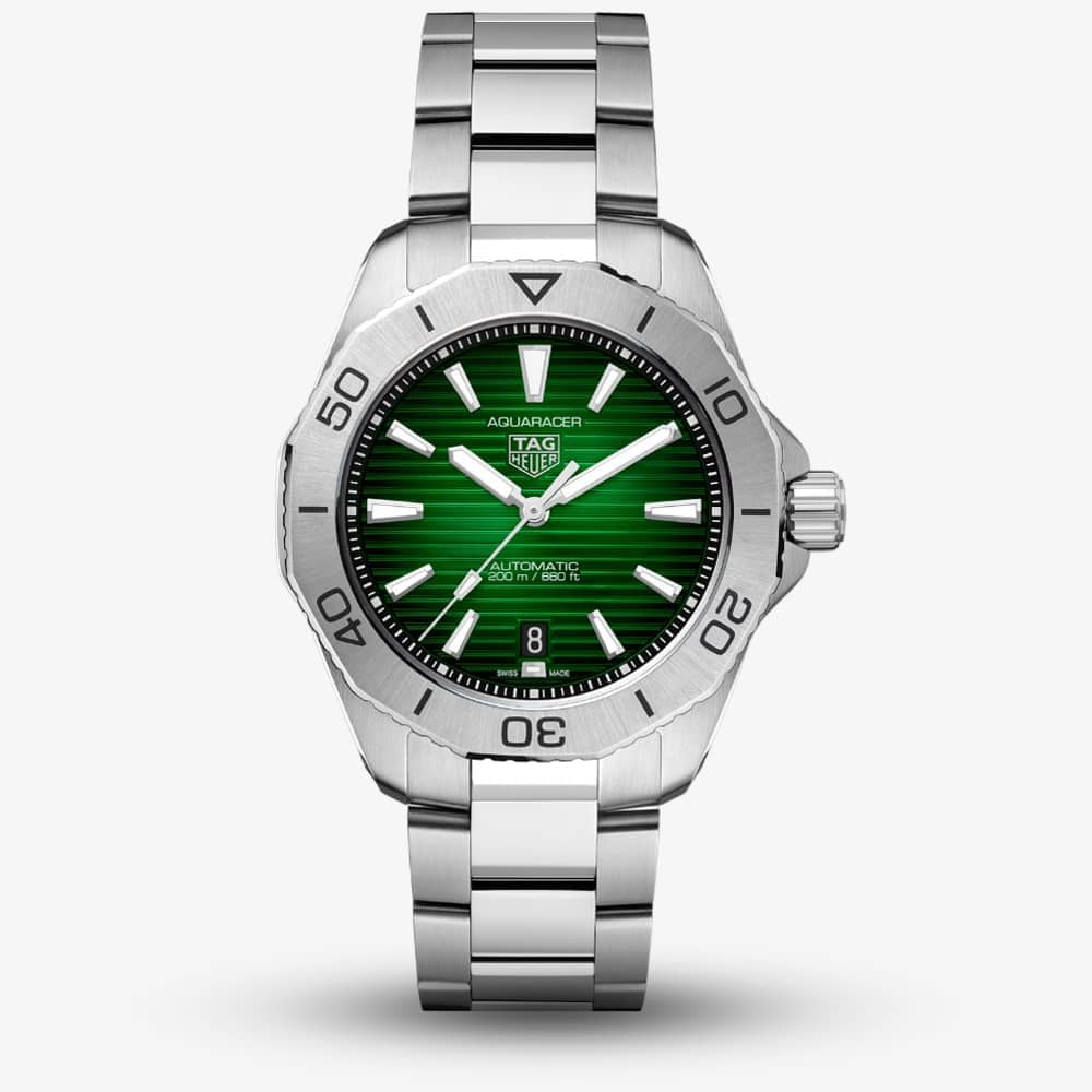 This TAG Heuer Aquaracer is a beautiful and elegant take on the standard Aquaracer. The dial is a green to black fade colour and features Stainless steel hands and hour markers. This design of the Aquaracer also features a silver tag badge on the centre of the dial. The watch also features a Stainless-steel unidirectional bezel.