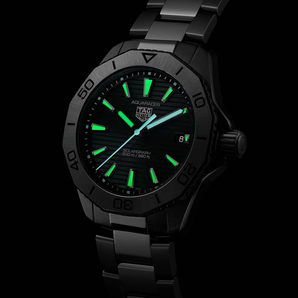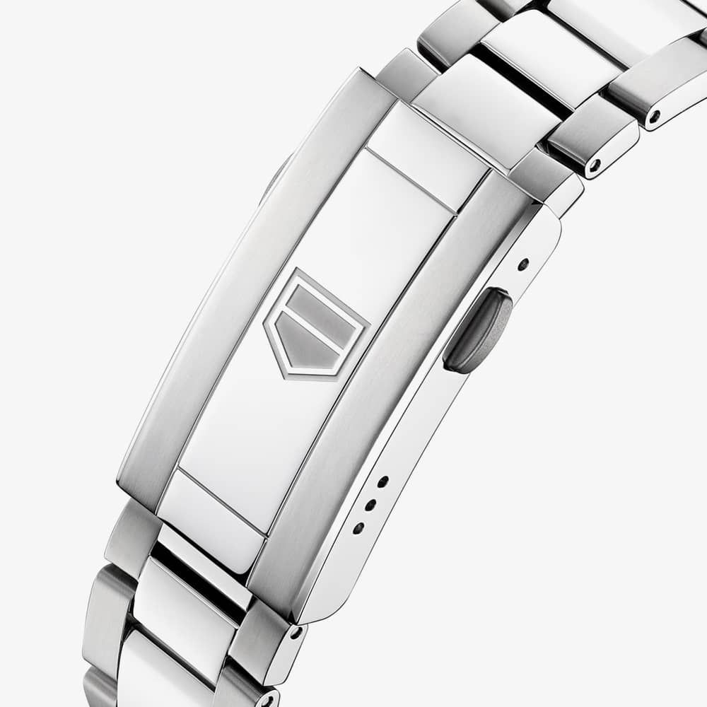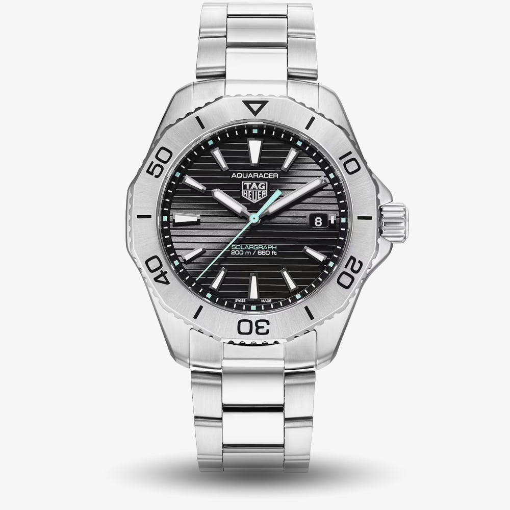 The TAG Heuer WBP1114.BA0000 Aquaracer watch combines a 40mm round-shaped case and stainless-steel bracelet with a push-button deployment clasp. It has a sun-brushed grooved black analogue dial with Super-LumiNova-filled hands and a date display, which is protected beneath scratch-resistant sapphire crystal glass. Power is generated by TAG Heuer’s TH50-00 Calibre Solargraph movement, which is powered by natural and artificial light.