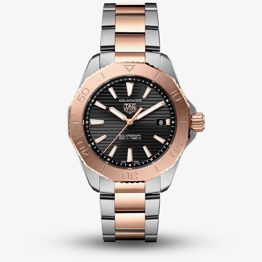 Blending elegance with innovation, the TAG Heuer Aquaracer Professional 200 Solargraph features a striking two-tone design enhanced by 18ct rose gold plating. Powered by cutting-edge Solargraph technology, this timepiece harnesses solar energy for exceptional precision and sustainability. The black dial is beautifully complemented by rose gold luminous hands and indexes, while the rose gold uni-directional bezel adds a refined touch of sophistication. Completed with a matching two-tone bracelet, this watch is a perfect fusion of advanced performance and timeless luxury.