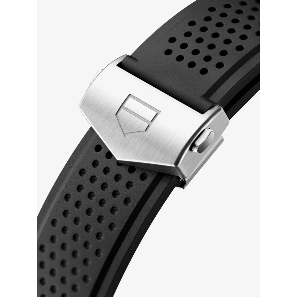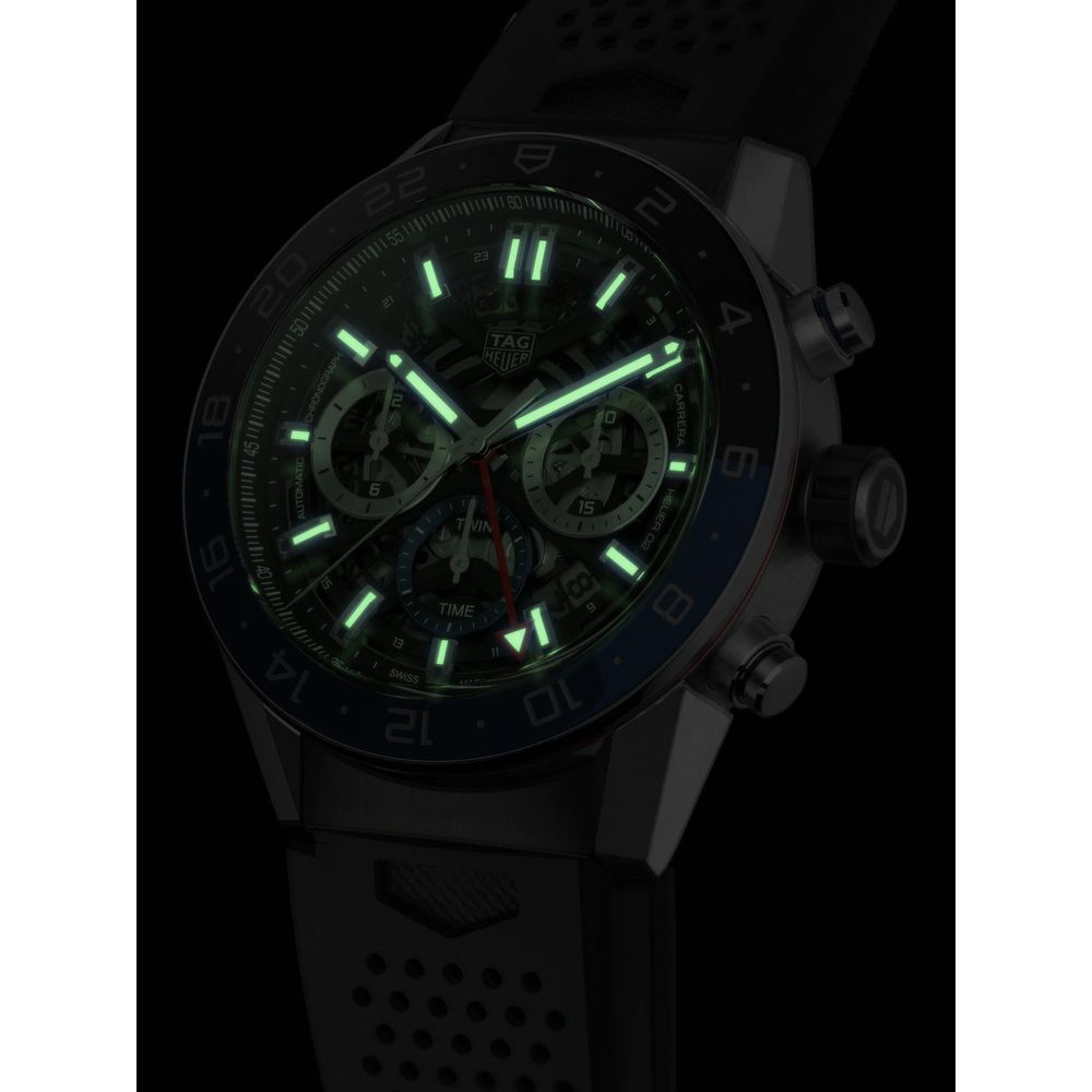The TAG Heuer CBG2A1Z.FT6157 Carrera watch combines a 45mm round shaped stainless-steel case and black perforated rubber strap with fine polished steel folding clasp. It has a skeleton analogue dial with two silver luminescent hands and a second tracker. There are 3 chronograph sub dials, 2 silver dials and 1 dark blue dial, which are protected beneath sapphire crystal glass. Power is generated by the automatic movement. This model also has a water resistance of up to 100 metres.