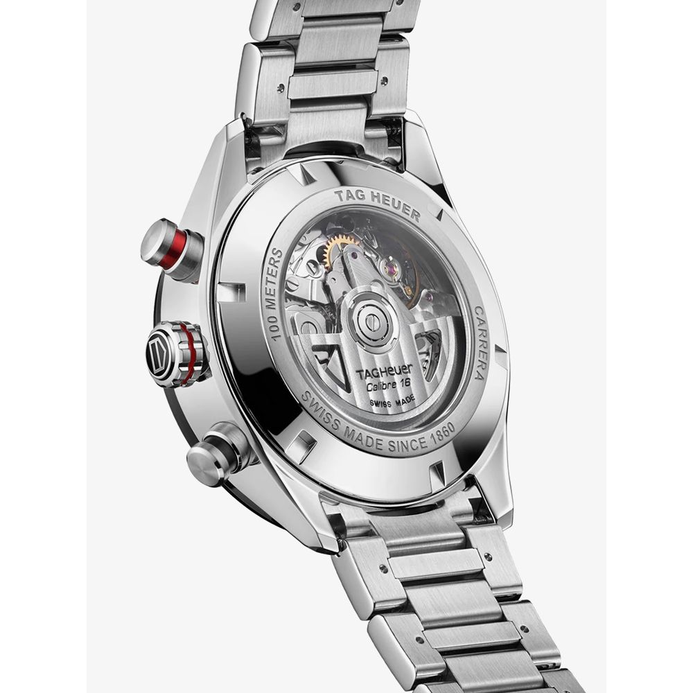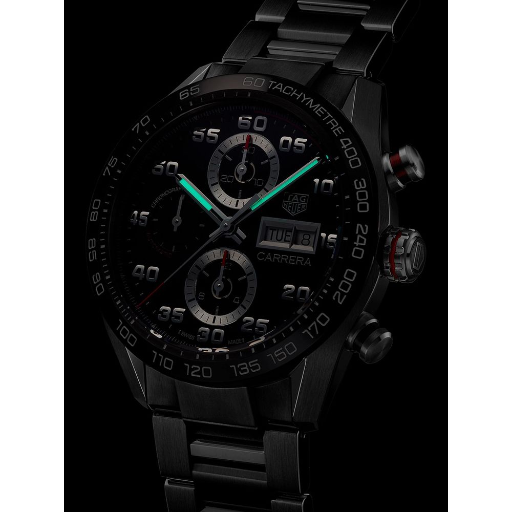 The TAG Heuer Mens Carrera Black Dial Chronograph Watch CBN2A1AA.BA0643watch combines a 44mm round shaped stainless steel case and silver stainless steel bracelet with a push button deployment clasp. It has a black analogue dial with luminescent hands, date display, chronograph sub-dials which is protected beneath scratch resistant sapphire crystal glass. Power is generated by the automatic movement which has a power reserve of 42 hours. This model also has a water resistance of up to 100 metres.