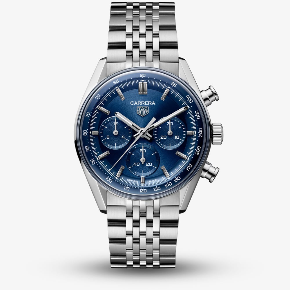 The TAG Heuer Carrera Chronograph CBS2113.BA0053 presents a 41mm timepiece that balances dynamic presence with refined elegance. Its blue circular-brushed dial, enriched with azurage sub-counters at 3, 6, and 9 o’clock, creates subtle depth and clarity, while a matching blue outer ring frames the polished rhodium-plated hands and indexes coated in white Super-LumiNova, ensuring readability in all light. Protected beneath a glassbox sapphire crystal and 3-dimensional flange, the tone-on-tone tricompax layout offers harmonious symmetry, reflecting TAG Heuer’s motorsport heritage with precision and style.