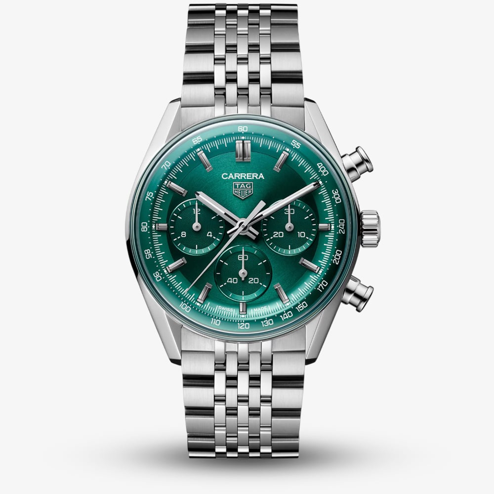 The TAG Heuer Carrera Chronograph CBS2115.BA0053 is a 41mm timepiece that combines contemporary elegance with technical precision. Its green circular-brushed dial is enriched with azurage sub-counters and a matching green flange with tachymeter scale, creating depth and visual balance. Polished rhodium-plated hands with white Super-LumiNova ensure clear, effortless readability from every angle, while the glassbox sapphire crystal protects the dial with scratch-resistant strength.