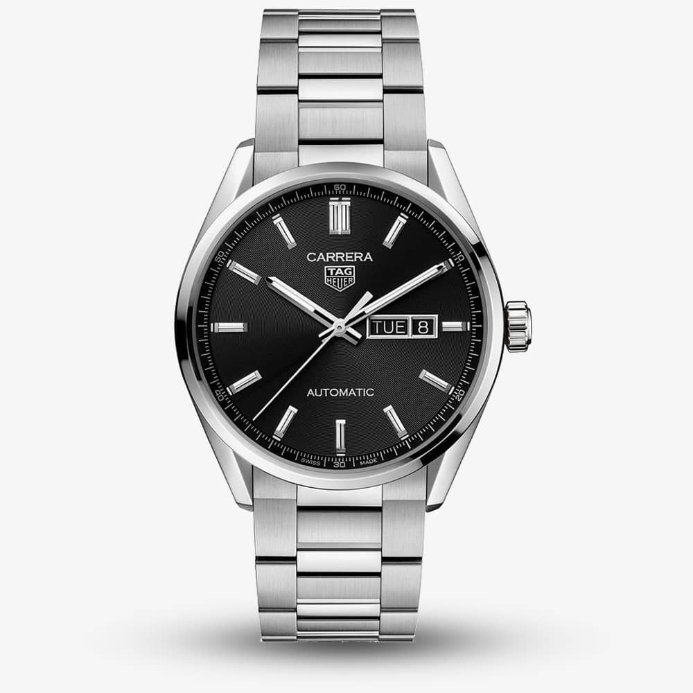 The TAG Heuer WBN2010.BA0640 Carrera watch combines a 41mm round shaped stainless steel case and H-shaped bracelet with a double push button clasp. It has a black patterned analogue dial with Super-LumiNova coated hands and a day/date display which is protected beneath domed and bevelled scratch resistant sapphire crystal glass with a double anti-reflective coating. Power is generated by the Swiss made Calibre 5 automatic movement with 26 rubies, rapid date correction, and a power reserve of approximately 38 hours. This model also has a sapphire crystal case back and a water resistance of up to 100 metres.