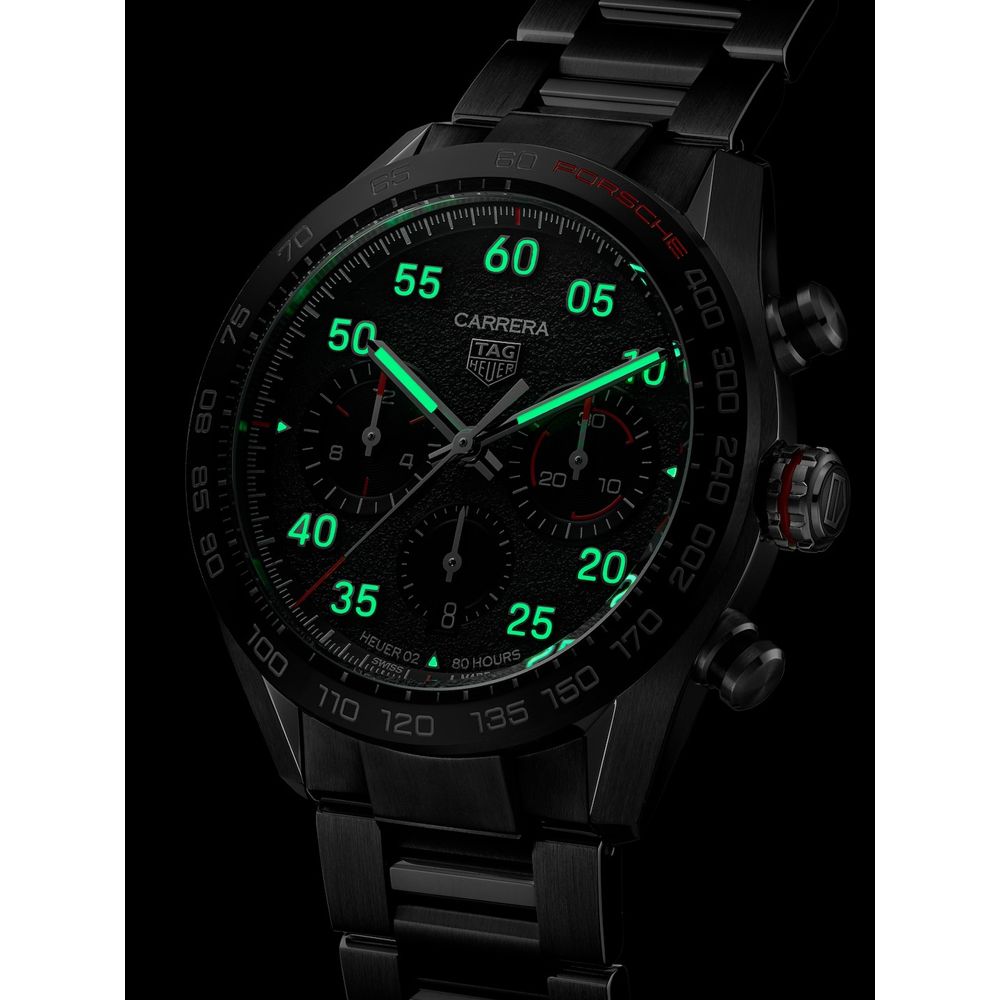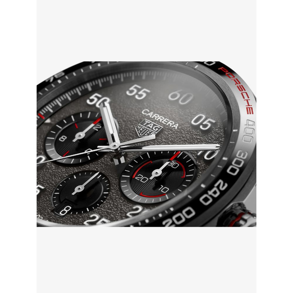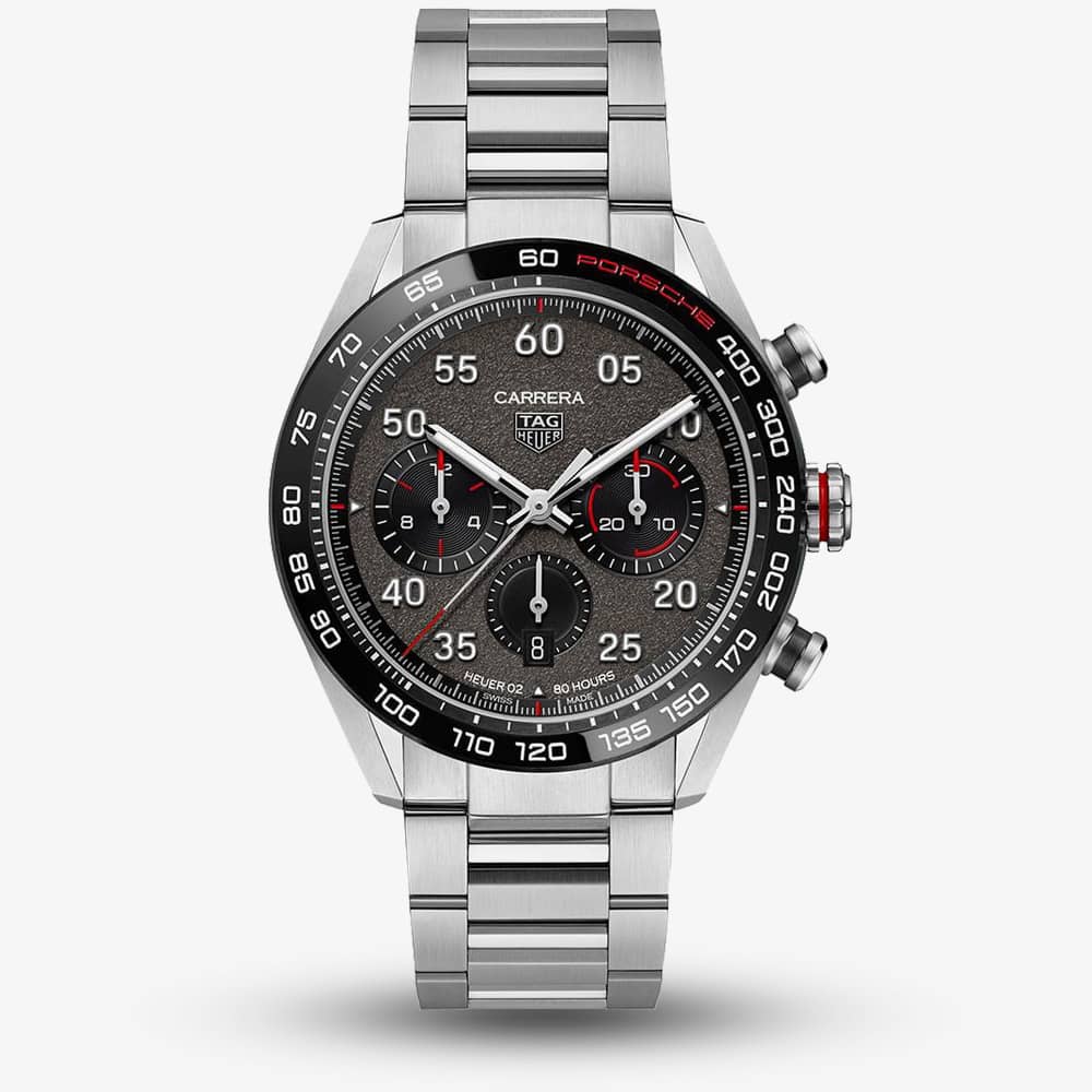 A special edition Carrera watch collaborated between TAG Heuer and Porsche combining a 44mm stainless steel case and bracelet with a push button deployment clasp. It has a grey dial with chronograph sub-dials, a date display and Superluminova coated dial hands, all of which is protected beneath domed and bevelled anti-reflective treated sapphire crystal. This model also has Porsche branding on the fixed black ceramic bezel as well as a tachymeter scale. Powering the watch is the Heuer Calibre 02 automatic movement and it also has a water resistance of up to 100 metres.