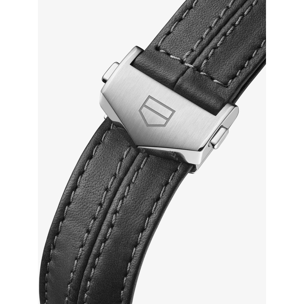 A special edition Carrera watch collaborated between TAG Heuer and Porsche combining a 44mm stainless steel case and grey leather strap with a push button deployment clasp. It has a grey dial with chronograph sub-dials, a date display and Superluminova coated dial hands, all of which is protected beneath domed and bevelled anti-reflective treated sapphire crystal. This model also has Porsche branding on the fixed black ceramic bezel as well as a tachymeter scale. Powering the watch is the Heuer Calibre 02 automatic movement and it also has a water resistance of up to 100 metres.