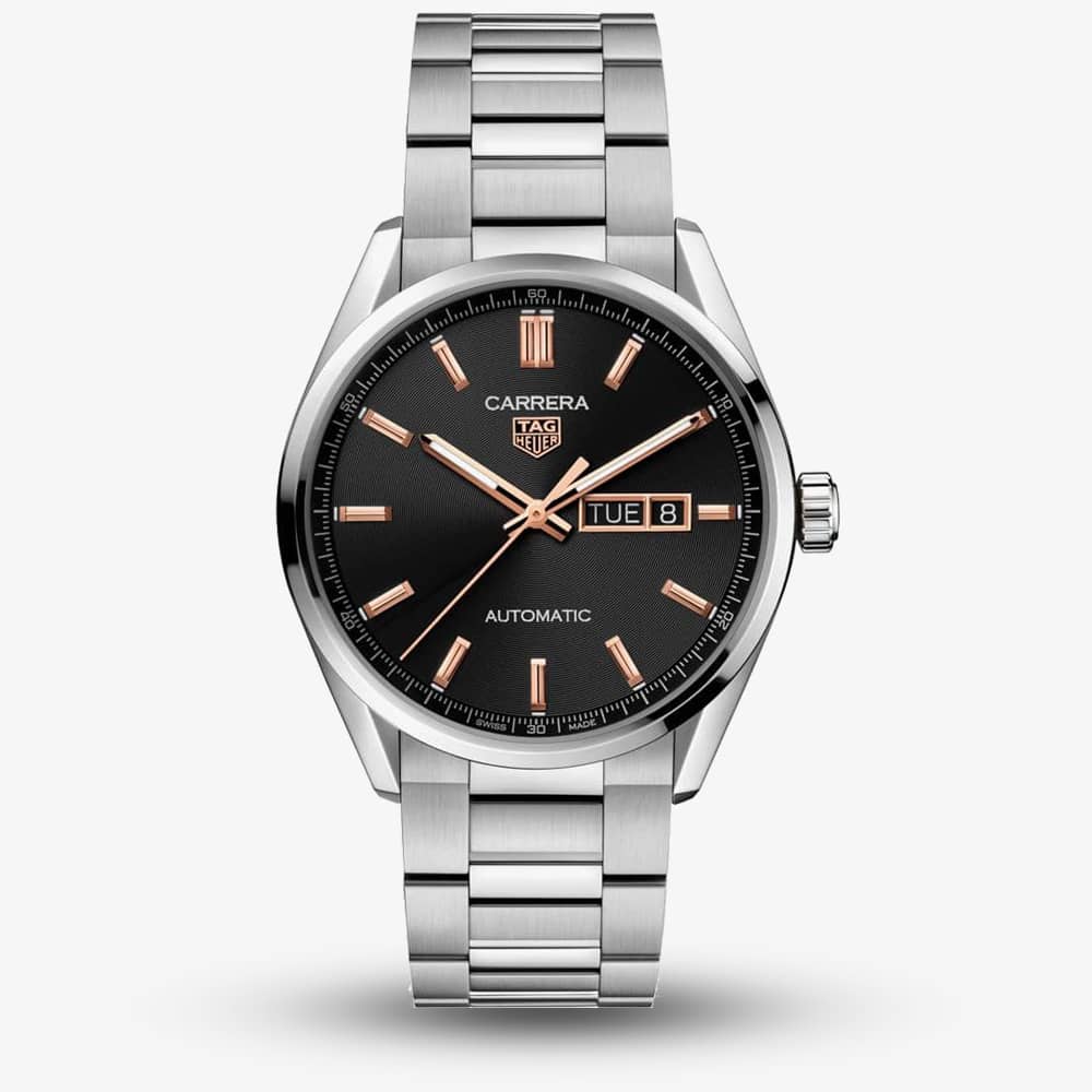 The TAG Heuer WBN2013.BA0640 Carrera watch combines a 41mm round shaped stainless steel case and bracelet with a double push button clasp. It has a black analogue dial with luminescent hands and a day/date display, all of which is protected beneath scratch resistant sapphire crystal glass. Power is generated by the Calibre 5 automatic movement with a 38 hour power reserve. This model also has a water resistance of up to 100 metres.