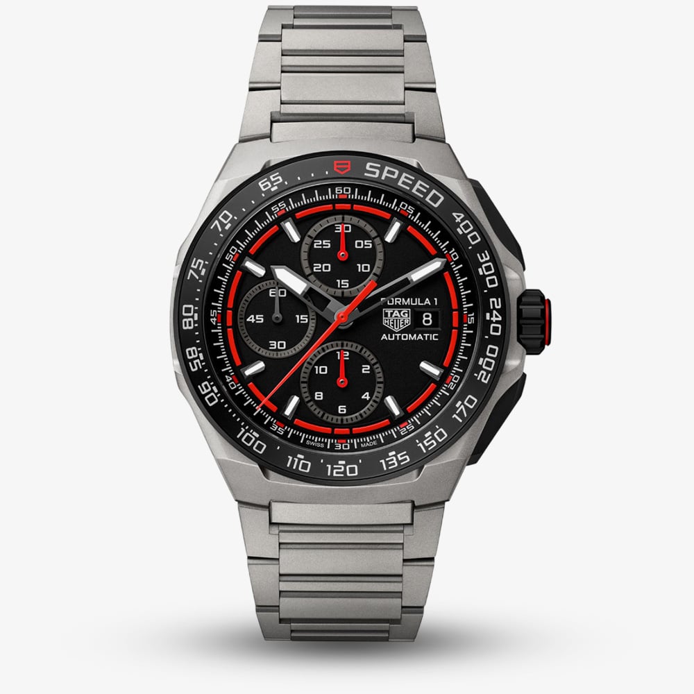 Uncompromising in design and performance, the TAG Heuer Formula 1 Chronograph is a bold 44 mm statement in sandblasted titanium. Driven by the powerful Calibre 16 automatic movement, it pairs rugged strength with refined sport aesthetics, highlighted by a black opalin dial, vivid red chronograph hand, and luminous rhodium-plated markers. Built to withstand depth, speed, and time, this is precision luxury for those who dare.