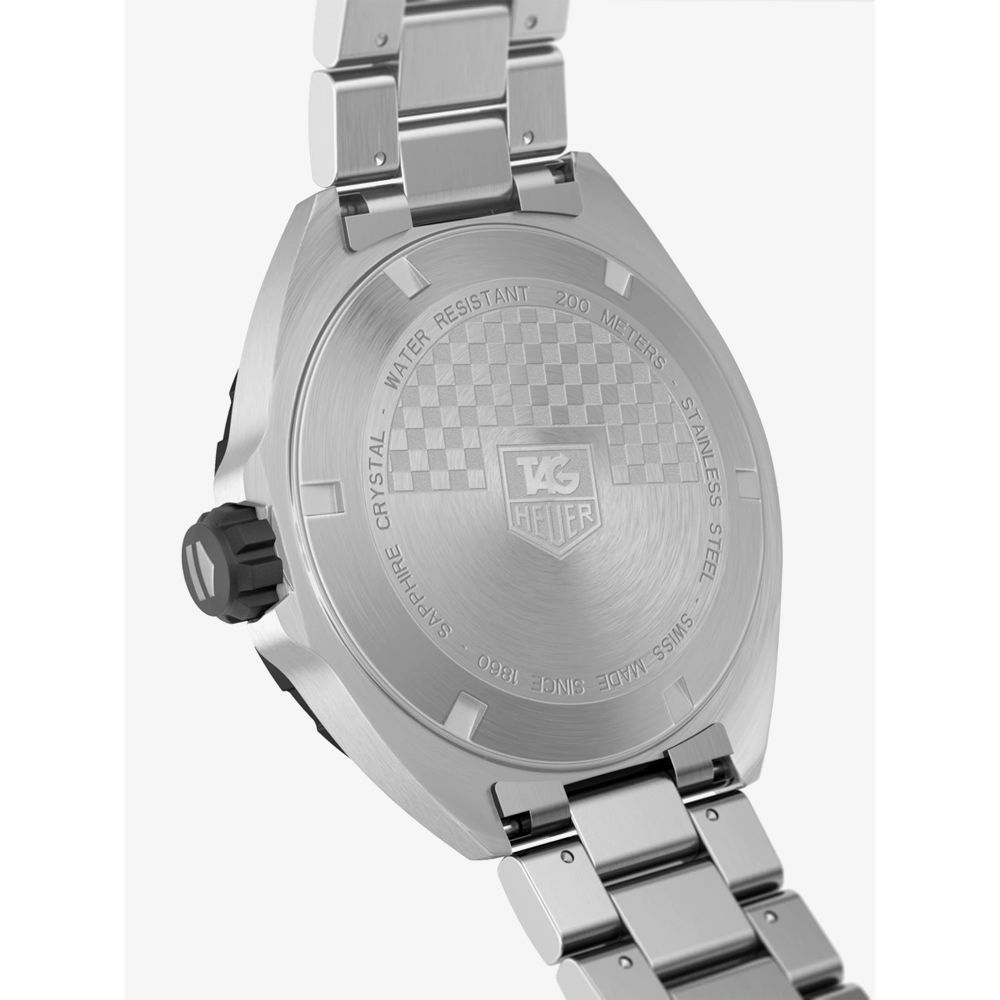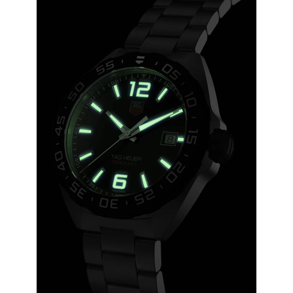 TAG Heuer F1 black dial quartz watch, this brushed finish stainless steel watch has a scratch resistant sapphire crystal glass and titanium carbide coated rotating bezel, and is 200 meters water resistant with a double folding safety clasp. The dial has luminescent hour markers and hands. Swiss Made.