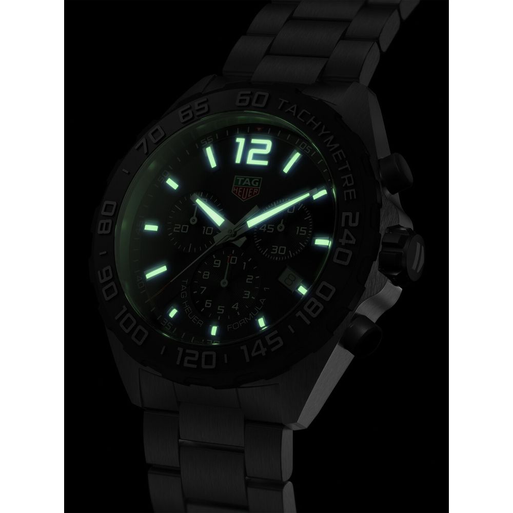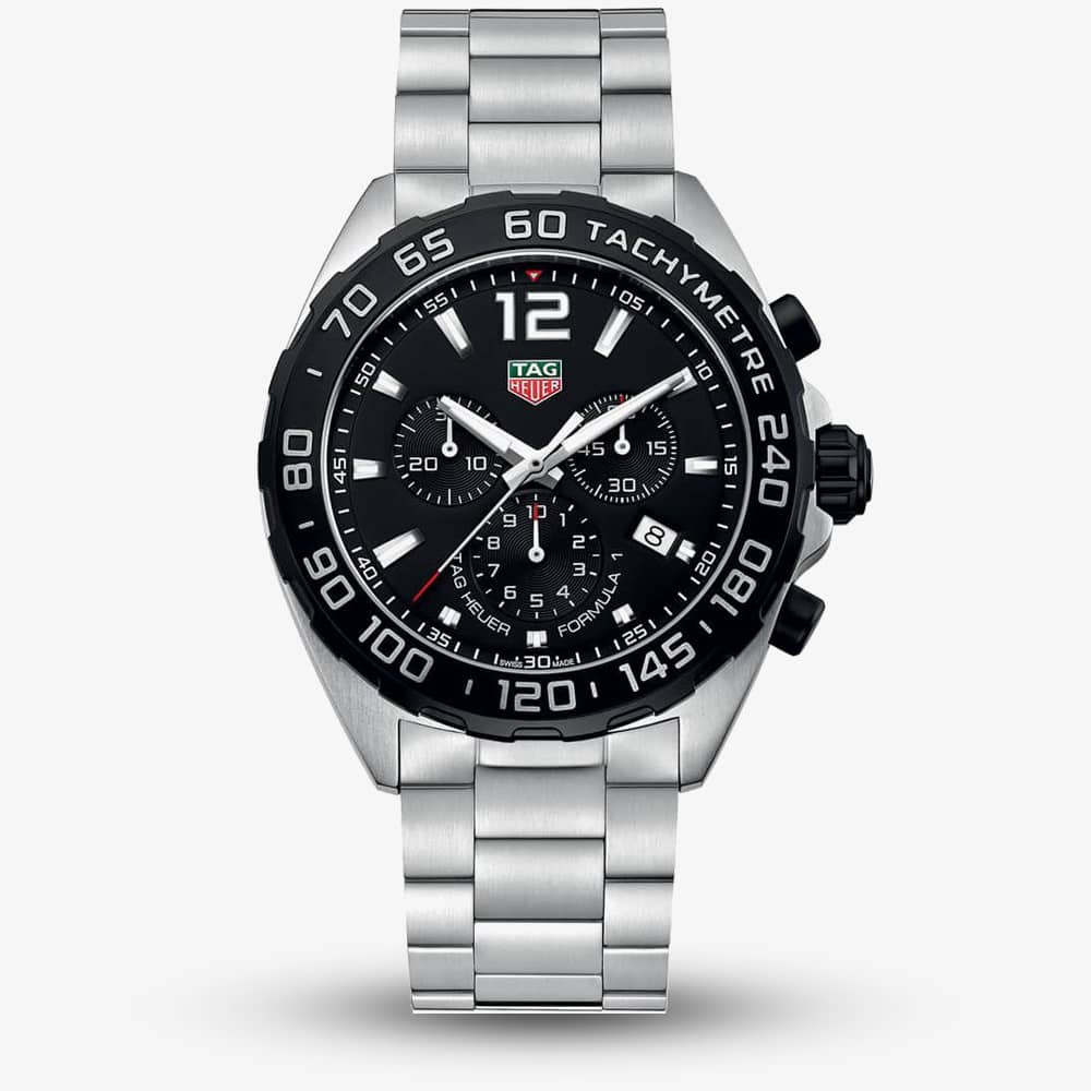 Spanning from the brands established roots with competitive Motorsports, we have this appealing timepiece from TAG Heuer's (established 1860) Formula 1 range. Bold yet elemental in design, its streamlined stainless steel case and bracelet, black titanium carbide coated uni-directional rotating bezel, anti-reflective scratch resistant sapphire crystal glass and charismatic black chronograph dial with luminous fixtures and date display is kindred to the persona of a modern F1 car, conveying a refined mien that conceals an enigma of technology - this being a Swiss quartz movement - secured within. Treat yourself or a loved one to this piece of impressive craftsmanship today.