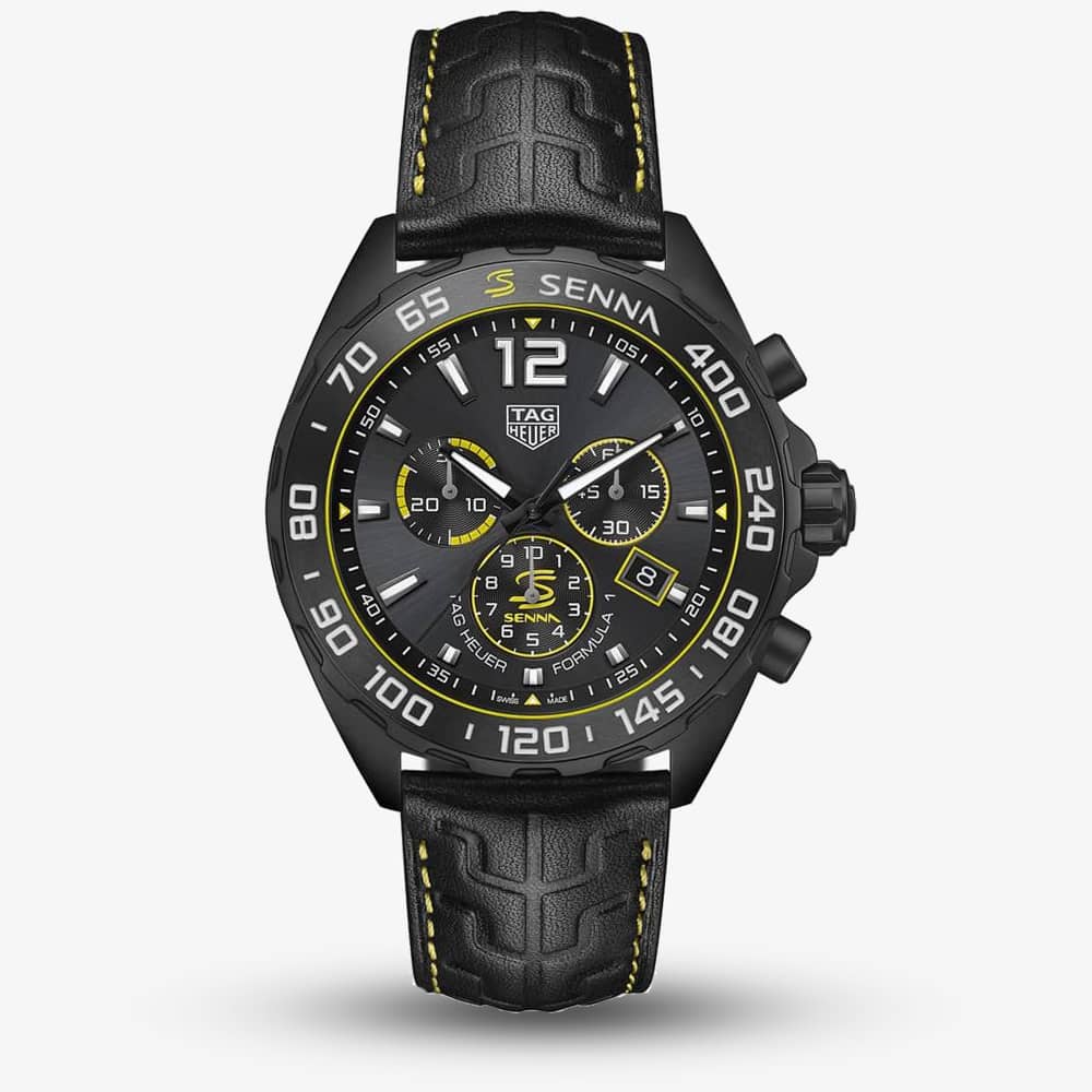 The TAG Heuer CAZ101AJ.FC6487 Special Edition Formula 1 Senna watch combines a 43mm round shaped black DLC coated stainless steel case and black embossed tyre tread effect leather strap with a double push button clasp. It has an anthracite sunray-brushed analogue dial with: yellow accents, Super-LumiNova coated hands, date display, and chronograph sub-dials, all of which is protected beneath flat scratch resistant sapphire crystal glass. Power is generated by the quartz movement. This model also has a special engraved case back, a water resistance of up to 200 metres, and a black brushed ceramic fixed tachymeter bezel.