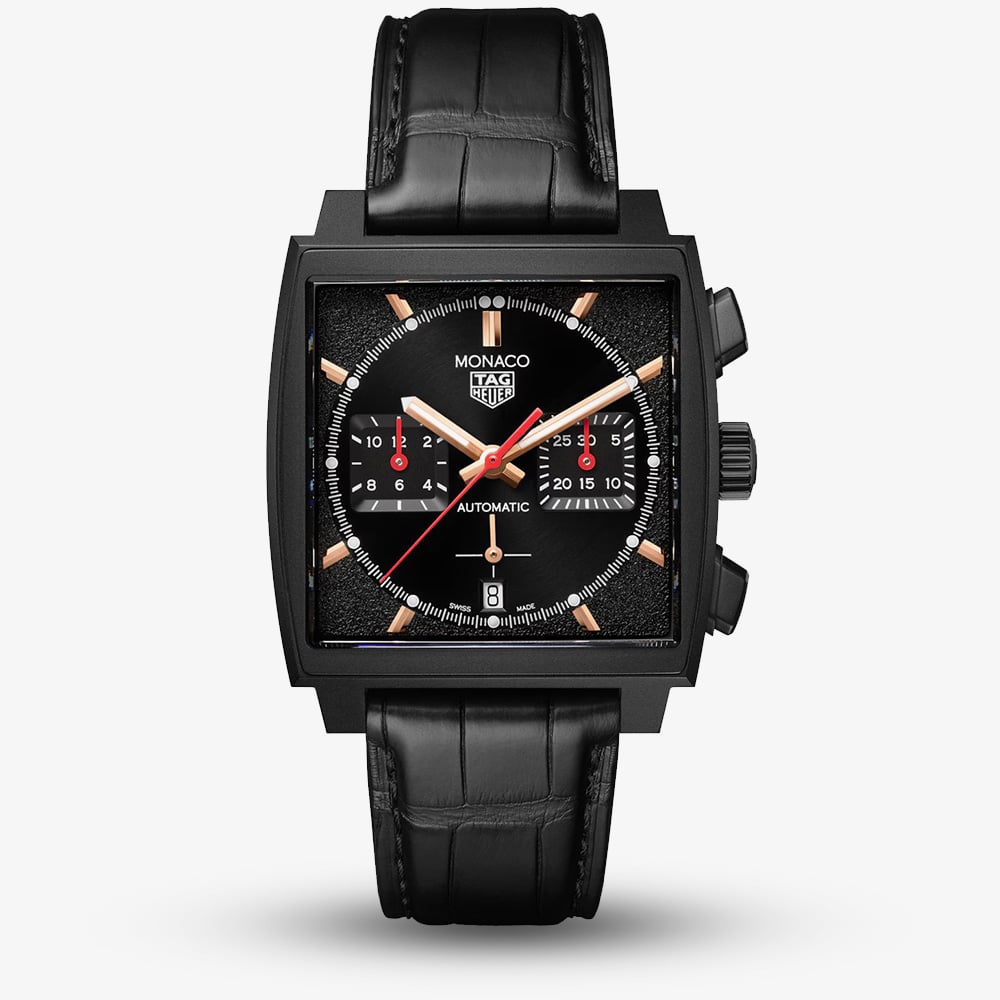 Honouring the mythical all-black Monaco of the 1970s, this TAG Heuer Special Edition is crafted for true enthusiasts. Its striking 39 mm black DLC titanium case houses the robust TAG Heuer manufacture Calibre TH20-00, delivering exceptional precision and performance. Rose-gold and red accents stand out against the deep black dial, while a exhibition caseback showcases the movement within. A modern TAG Heuer tribute to a legendary icon.