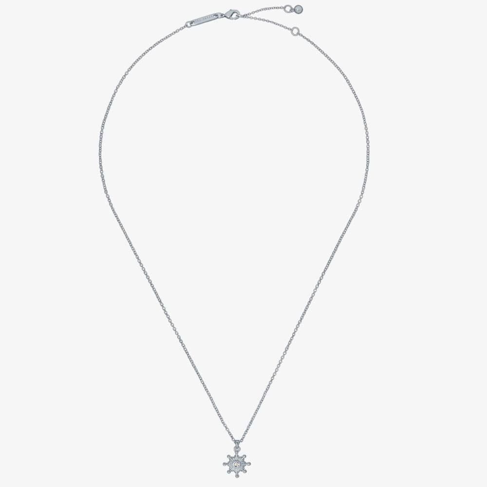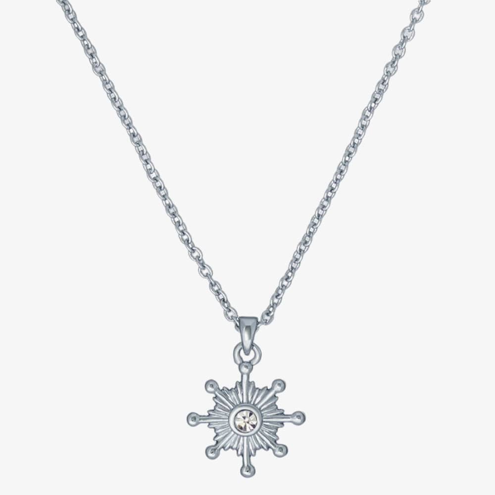 This Ted Baker Celstia necklace is delicately crafted from base metal with silver plating. Suspended on the dainty trace chain is a celestial star set with a round crystal at the centre. The chain measures 50cm in length but has the addition of two other clasp rings for a tighter or looser fit.