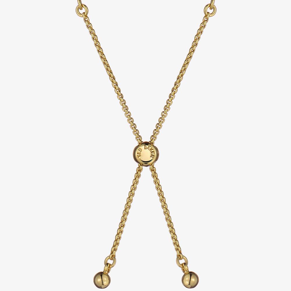 This gorgeous Ted Baker Isabela toggle bracelet is fully adjustable. It is adorned with clear, sparkling cubic zirconia stones, and it’s made from brass with a gold tone plating.