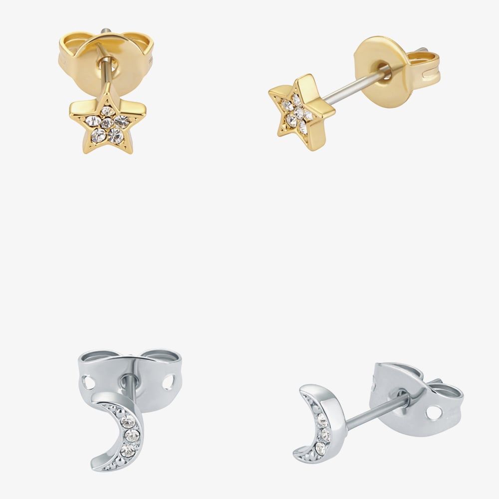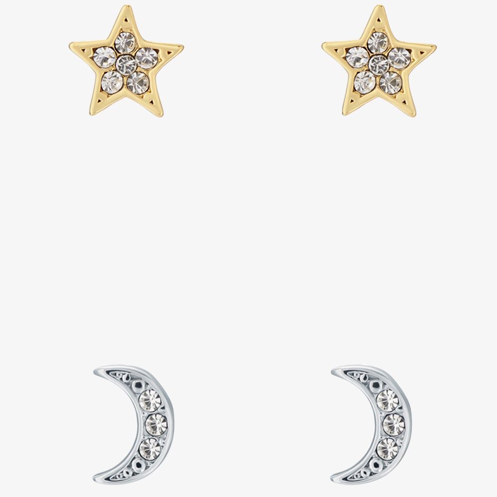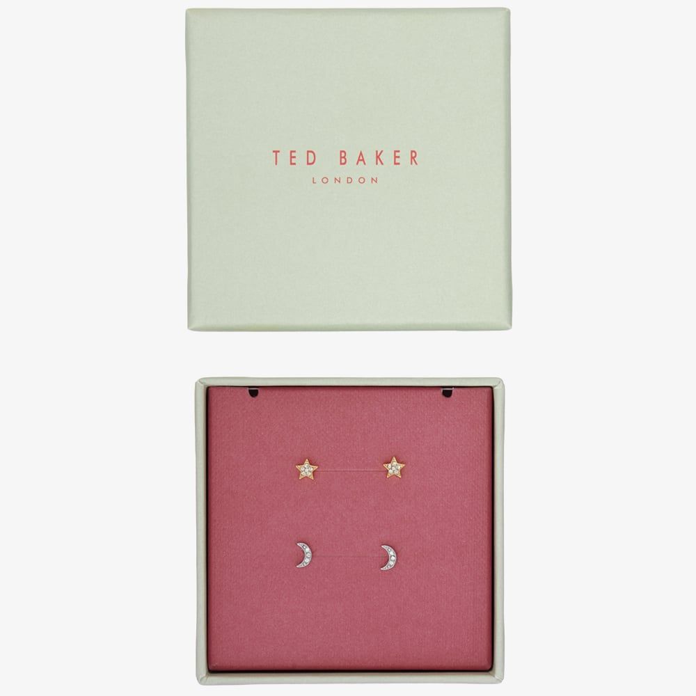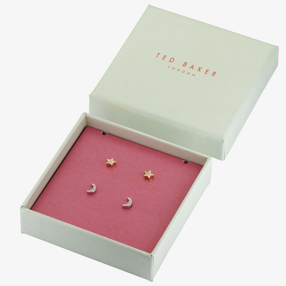 For a look thats as glittery as the stars in the sky, the Ted Baker MELANYY gift set has you covered. This dainty little branded gift box includes a pair of star-shaped studs and a matching pair of moon-shaped studs. Both earring sets are hand-finished with pave crystals and feature contrast silver-tone and gold-tone plating. They are perfect for adding celestial glam to your look, no matter where on Earth you are headed. Dimesnions Star Height 4.76mm Width 4.76mm. Moon Height 5.23mm Width 1.65mm. Care To ensure the longevity of Teds jewellery, just follow this golden rule- it should be the last thing you put on in the morning and the first thing you take off in the evening. Be sure to keep it away from lotions, perfumes, hairspray & chemicals and do not wear in water.