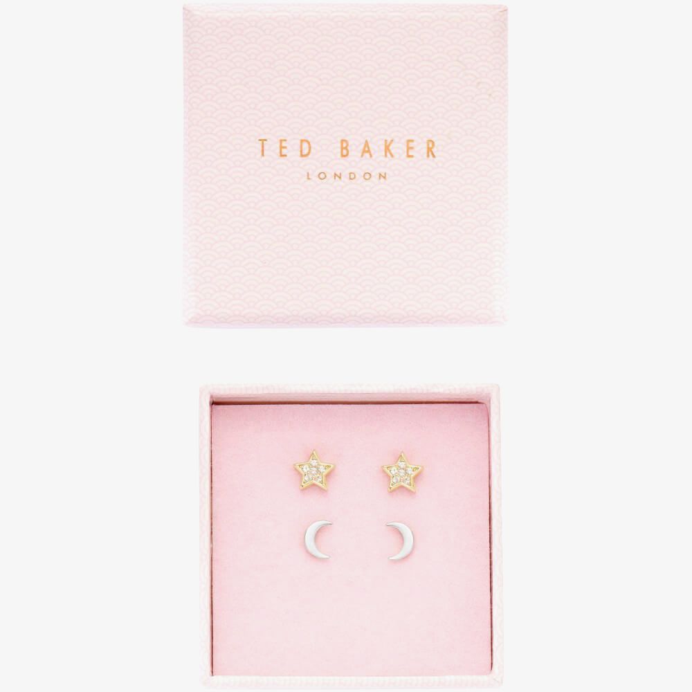 The Ted Baker Moanny Two Tone Pave Star & Crescent Moon Stud Earring Set TBJ2621-23-02 are created from base metal. The earring set features a pair of pave star stud earrings and a pair of crescent moon stud earrings.