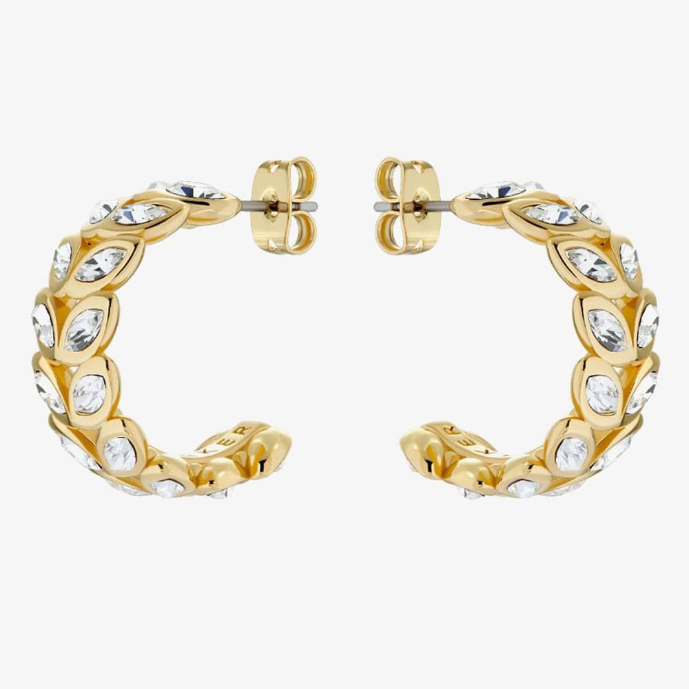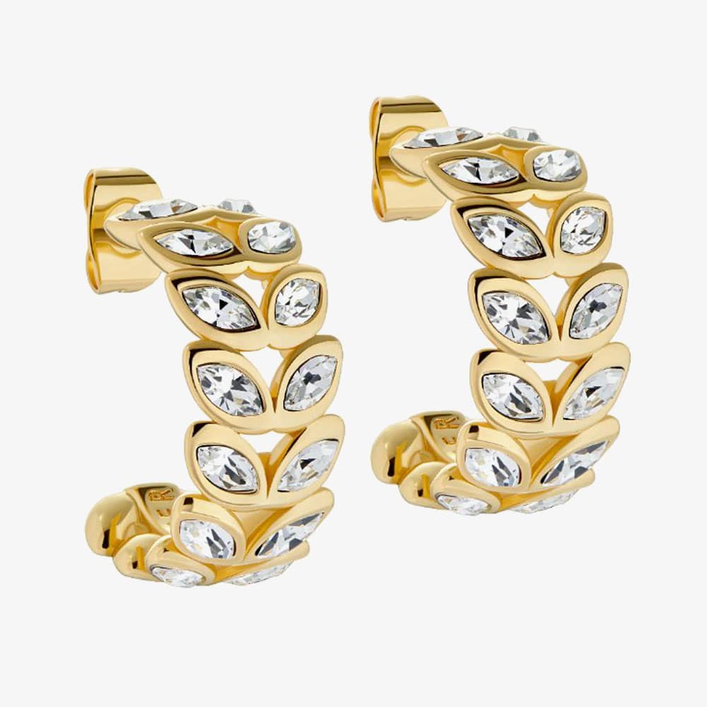 The Ted Baker Senelda Serpentine hoops are delicately crafted from base metal and coated in yellow gold plating. This delicate design features two rows of crystals set in a leaf pattern, forming these intricate half-hoop earrings, securely fastened with a butterfly backing.