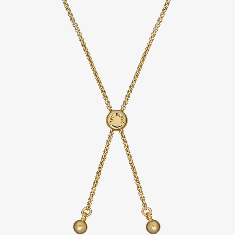The Ted Baker Soletia bracelet is a timeless piece. Meticulously crafted, its gold-toned brass chain features a delicate circle pendant adorned with a sparkling white crystal encased in a halo of smaller stones. The adjustable belcher toggle chain adds a sophisticated finishing touch.