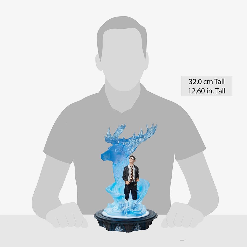 Bring the magic of Hogwarts to life with the Harry Potter & Patronus Figurine from The Wizarding World of Harry Potter. Featuring Harry in his school robes surrounded by his Stag Patronus in iconic icy blue, this enchanting piece lights up via USB and comes in a branded gift box, making it a perfect gift or collectible for Harry Potter fans.