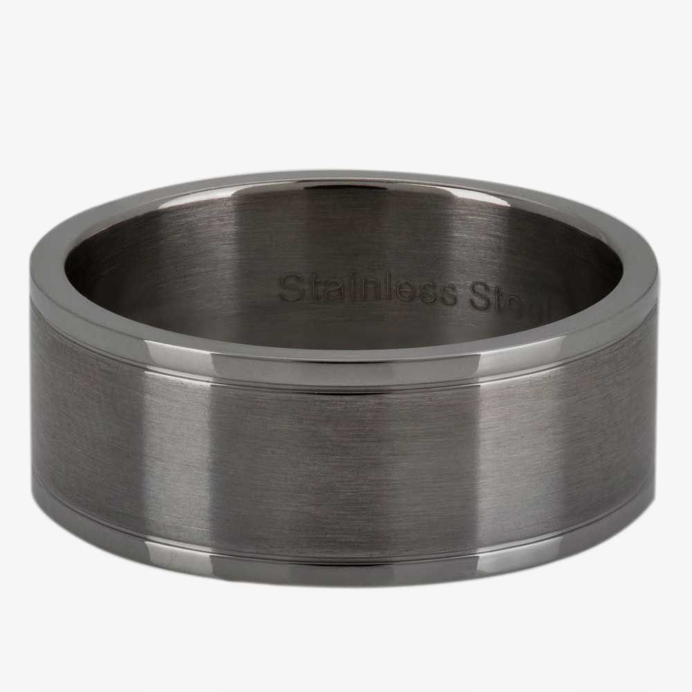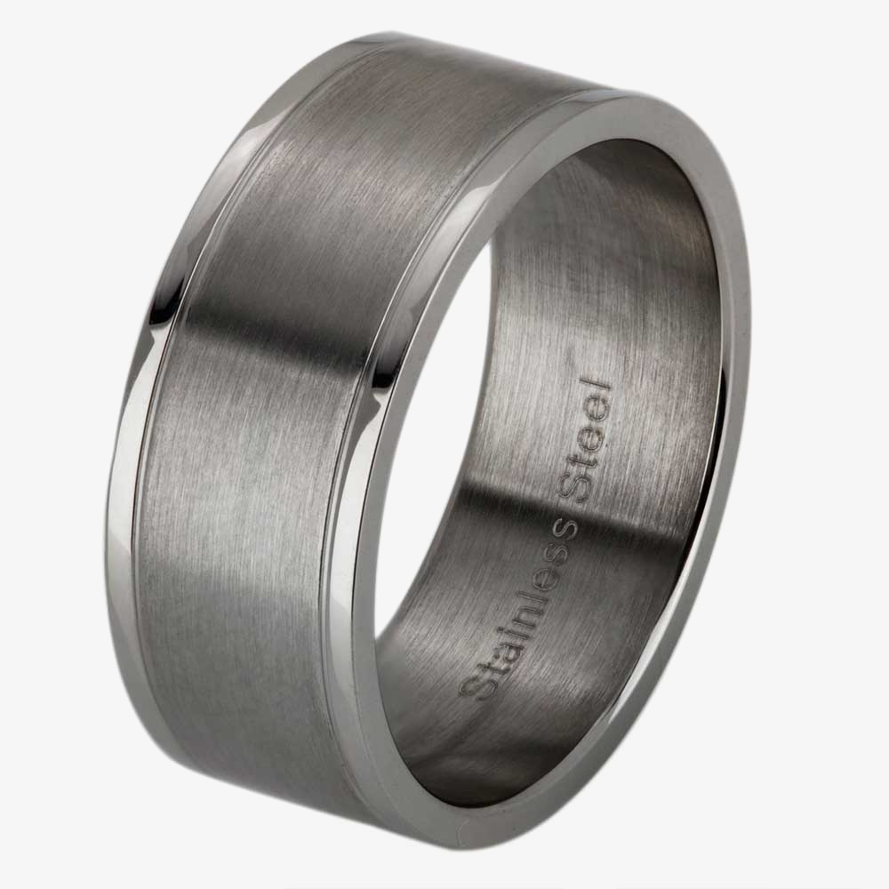 A simple, yet stylishly designed mens ring which features a matte band along with elegant polished edges, all crafted from stainless steel.