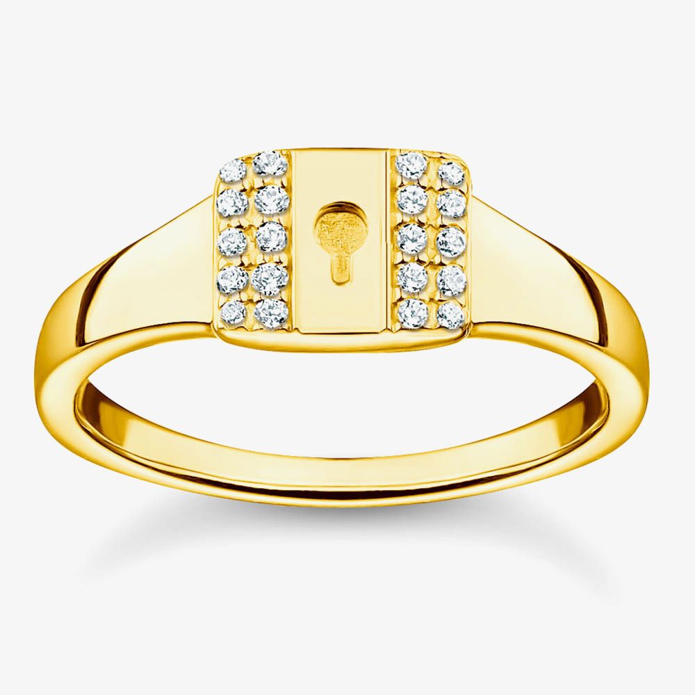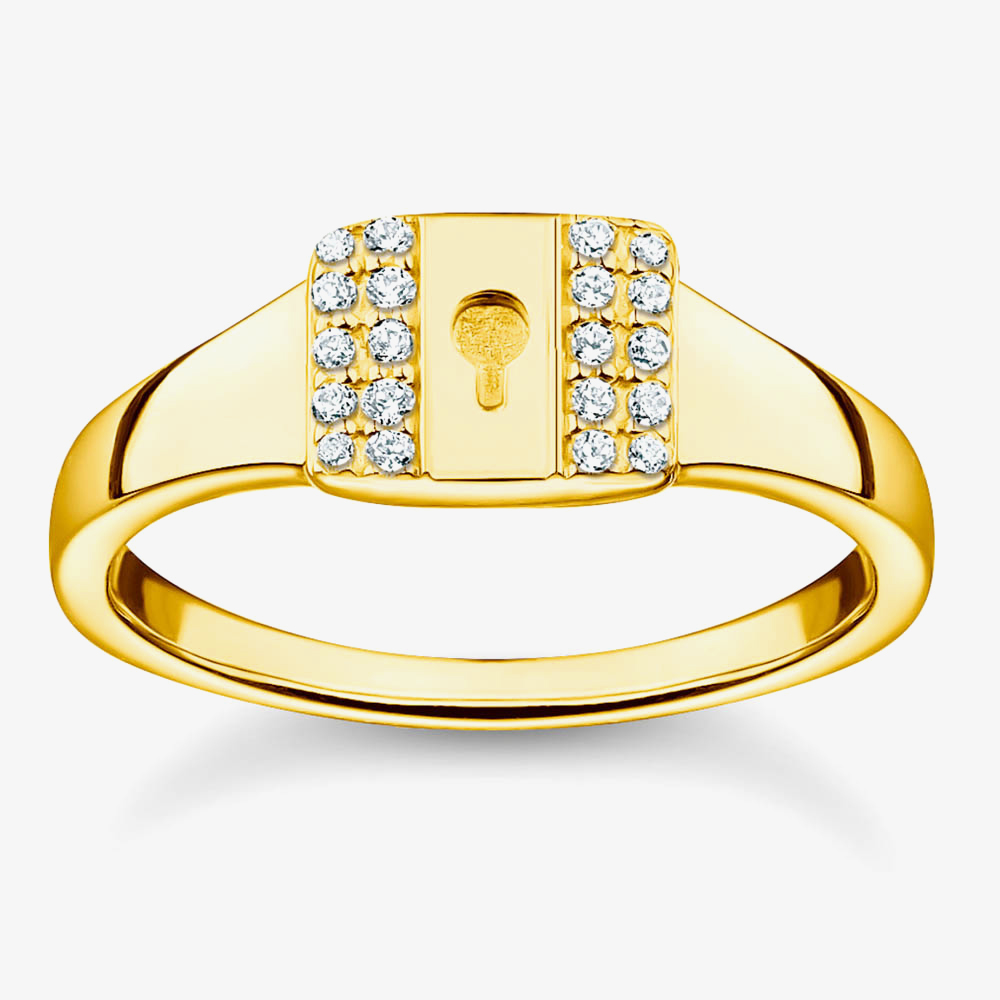 Locked in your Heart: This sterling silver with 18ct yellow gold plating lock design ring delights with its detailed workmanship with an authentic lock design which glistens with pave set white cubic zirconia stones. The perfect gift for your loved ones & ideal for combining with matching love lock bracelets, necklaces or earrings.