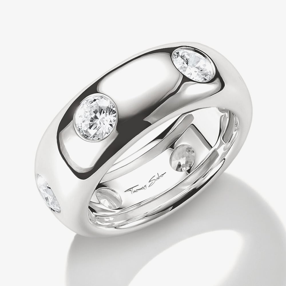 Add a touch of Bold Elegance to your look with this sterling silver ring by Thomas Sabo. A smooth, wide band is set with evenly spaced white cubic zirconia for subtle points of sparkle and the rounded shank allows for high wearing comfort. Wear alone as a statement piece or pair with other rings from the Bold Elegance collection for a personalised and sculptured look.