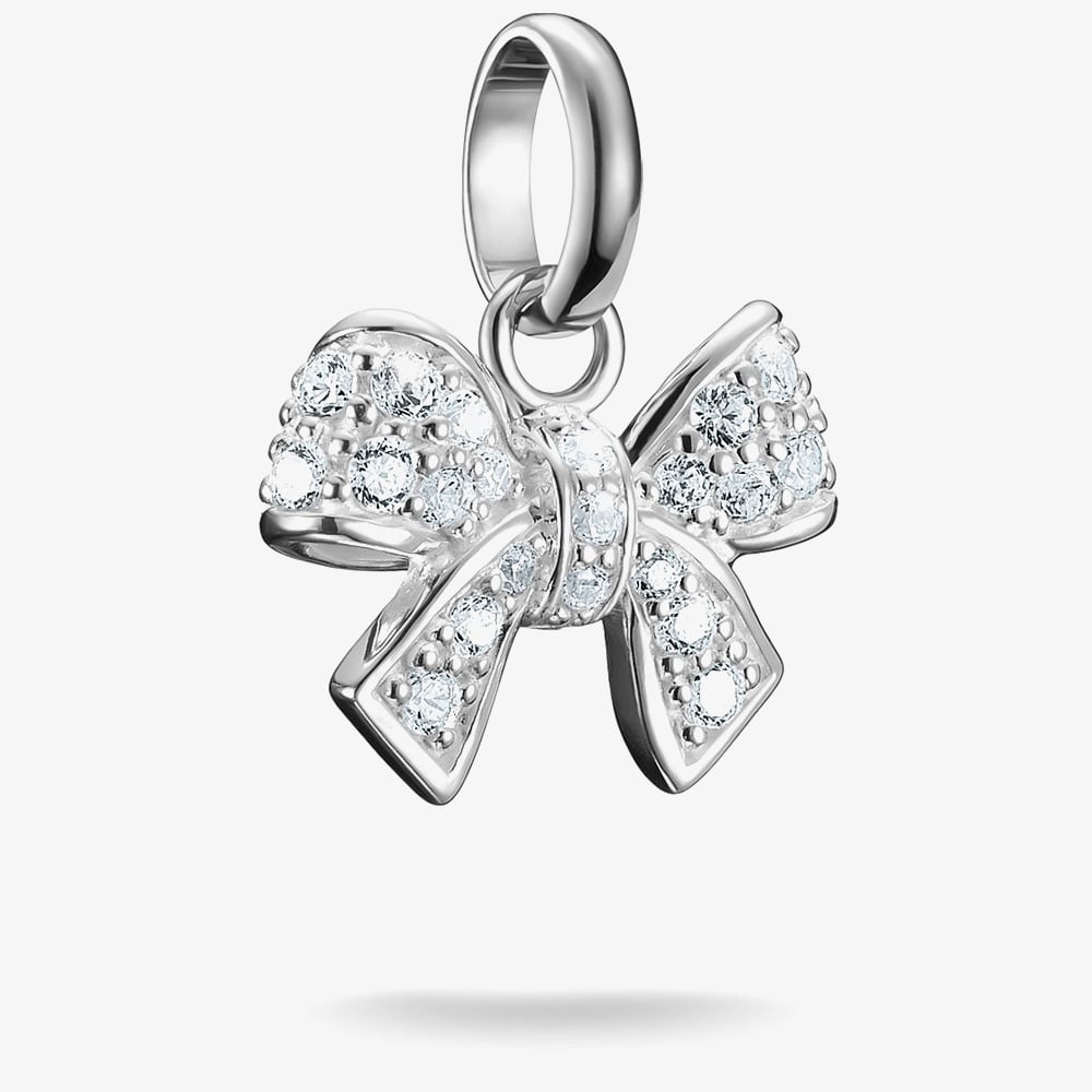 Delicately crafted from recycled 925 sterling silver, this dangle charm features a graceful bow design, symbolising elegance and the beauty of connection. Accented with white cubic zirconia stones, it adds a subtle sparkle to your look. A timeless piece perfect for adding a touch of femininity and sophistication to your jewellery collection.