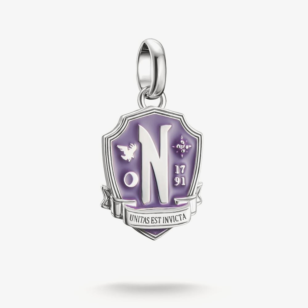 The Thomas Sabo Charm Club Connect Wednesday Nevermore Charm brings the iconic Nevermore Academy crest to life, crafted from recycled sterling silver with a blackened finish and striking violet enamel detail. Perfect for fans of Wednesday, this charm captures the magic and mystery of the series while showcasing a bold gothic style. Compatible with Charm Club Connect only.