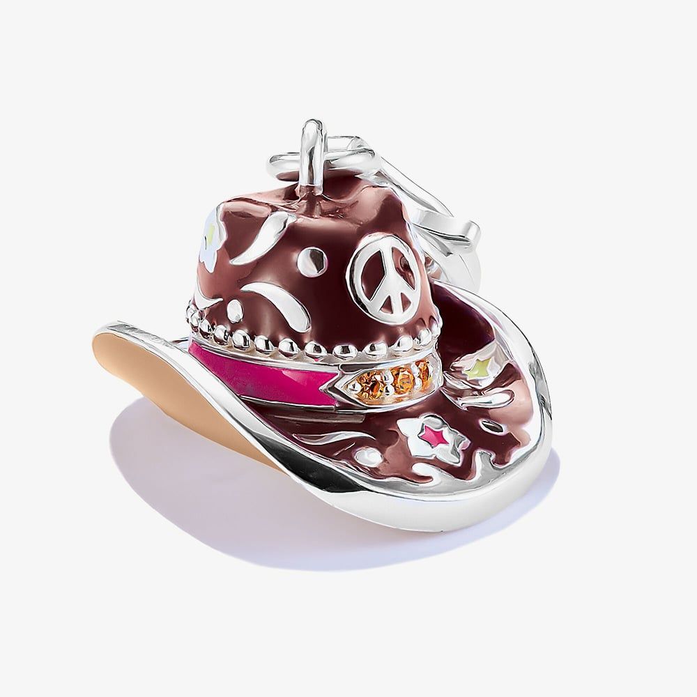 Channel your inner cowboy or cowgirl with this charming 3D cowboy hat, featuring "Howdy" lettering on the brim. The vibrant enamel colors in red, magenta, beige, brown, and green, along with a peace sign, add a playful touch. Attach it to any charm necklace or bracelet with the lobster clasp for a fun, lively accessory.