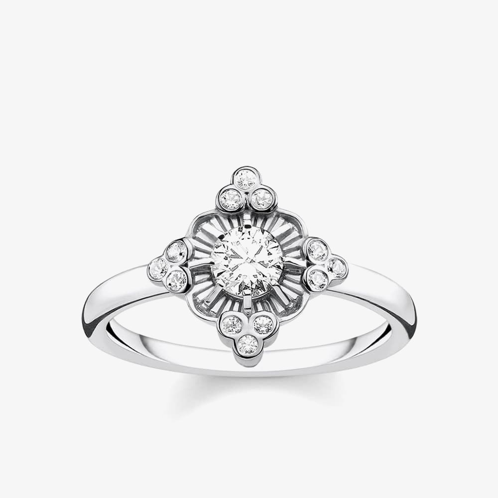A gorgeous looking ladies ring from THOMAS SABO which consists of a sterling silver band complete with a collection of sparkling cubic zirconia in a clear radiant centre.