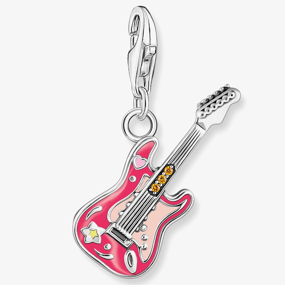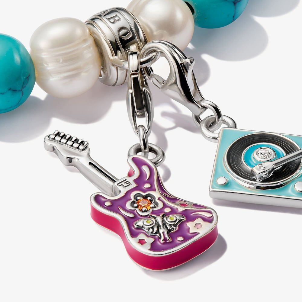 Strike the perfect chord with this detailed 3D electric guitar charm, featuring vibrant filigree flowers and enamel patterns in magenta, purple, pink, beige, and green. Easily attachable to a Charm Club necklace or bracelet with the lobster clasp, it’s the ideal accessory for a festival outfit or a standout daily companion.