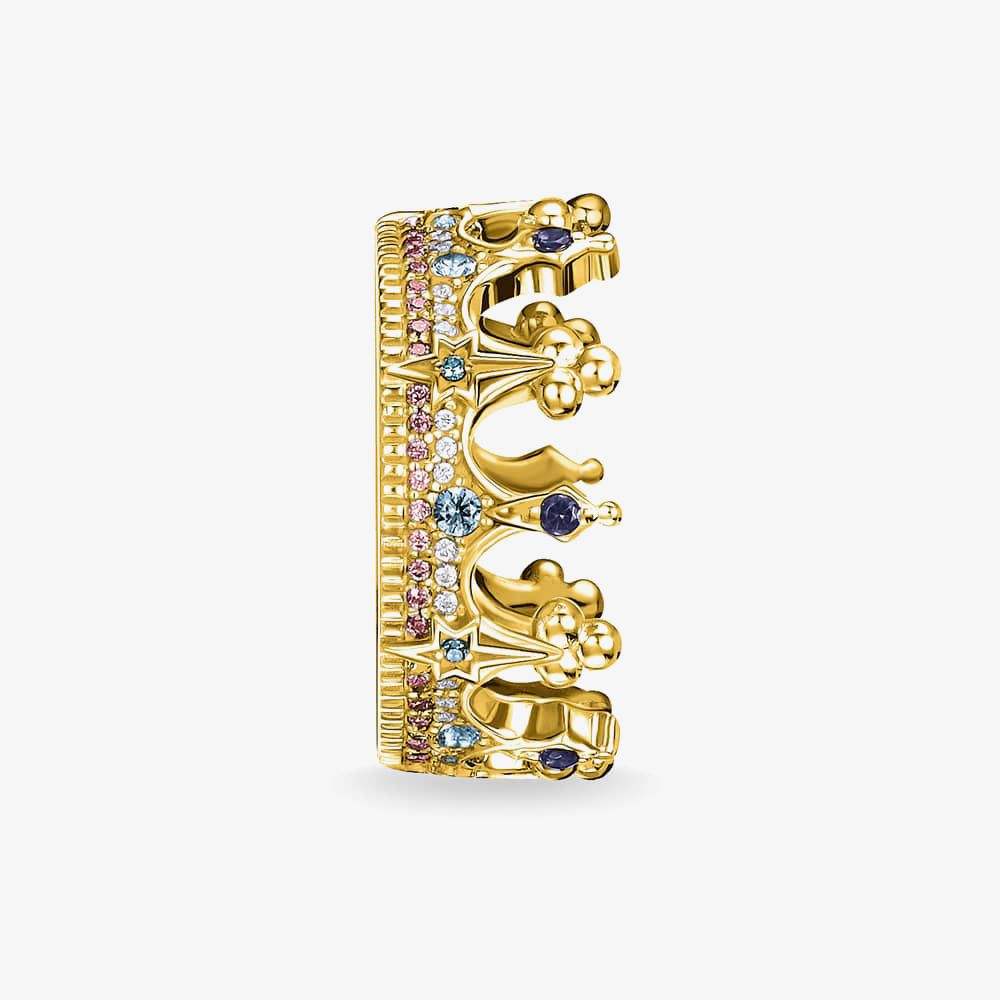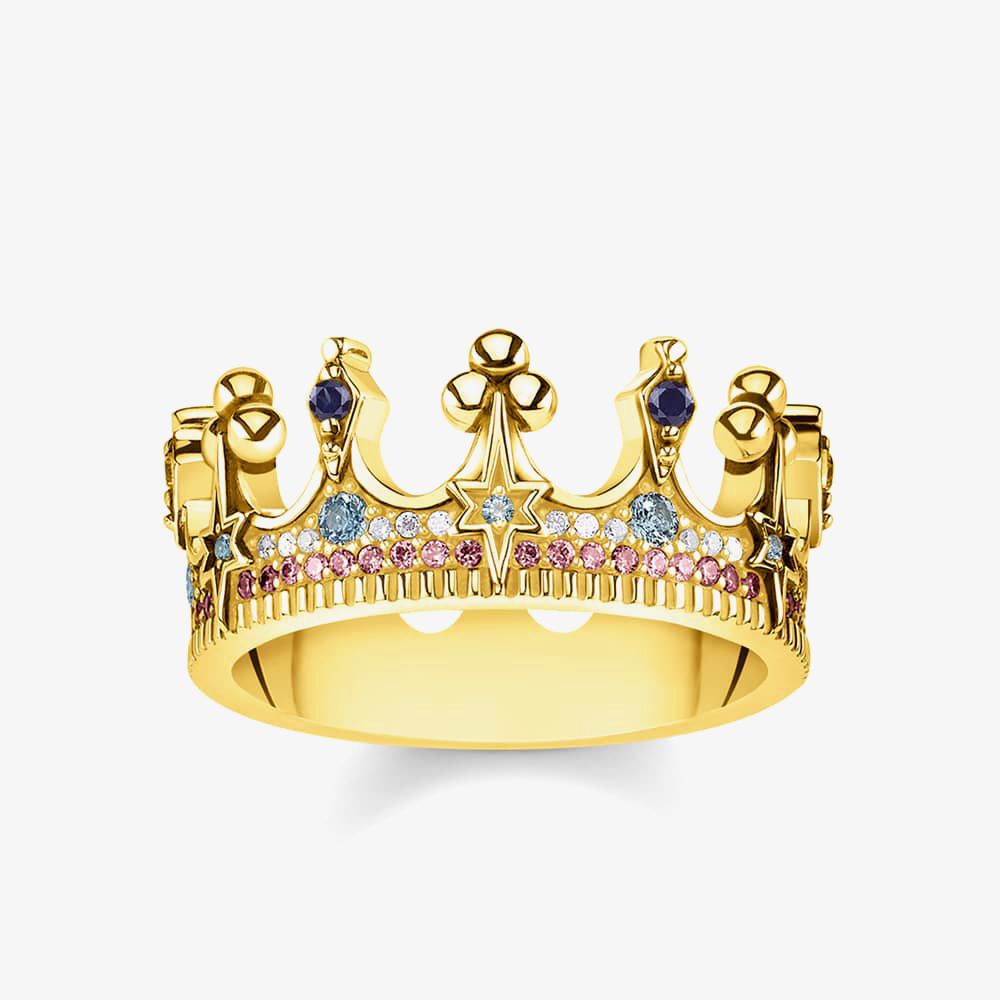A gorgeously crafted ring from THOMAS SABO which comes crafted from gold tone material in the form of a precious crown. Studded with a collection of green, pink and other coloured stones set around the band.
